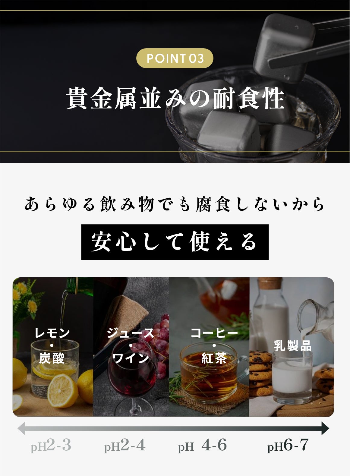 しかしこのチタンアイスキューブなら、どんな飲み物でも安心して使い続けることができます。