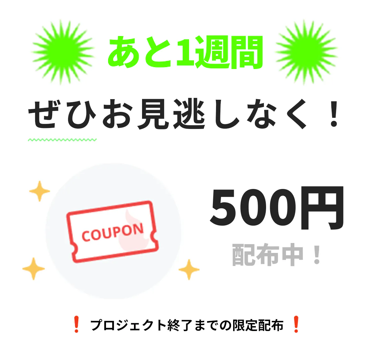 【あと1週間!】プロジェクト終了間近!全員に500円OFFクーポンをプレゼント!