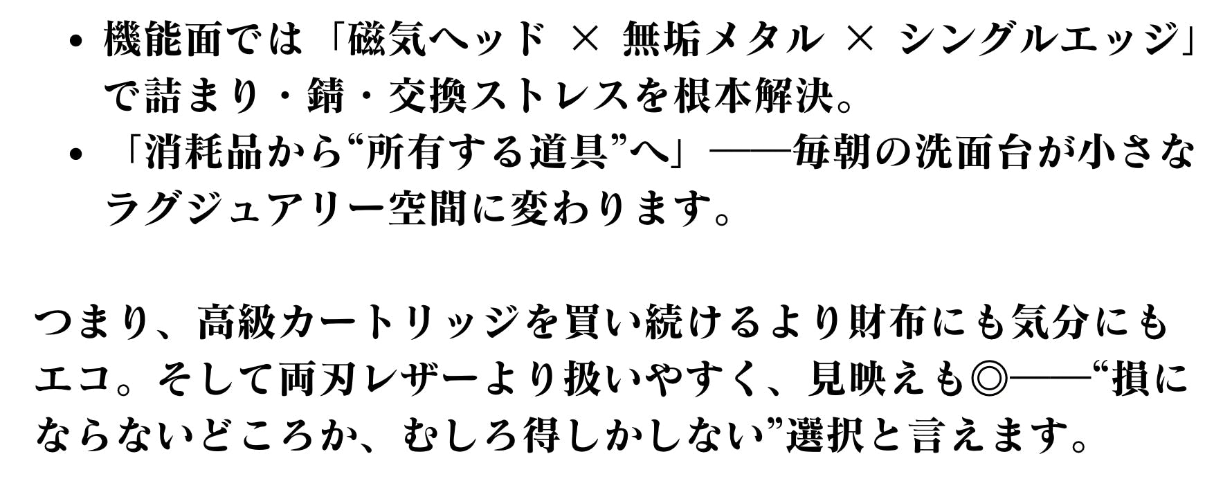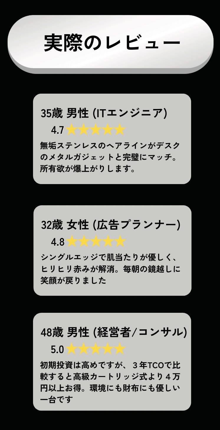- 特徴:使い捨てではない再利用型、電気不要、高級感あるメタルボディ