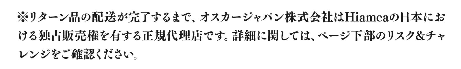 ※リターン品の配送が完了するまで、オスカージャパン株式会社はHiameaの日本における独占販売権を有する正規販売代理店です。並行輸入品が発生する可能性がございますが、並行輸入品には正規代理店による製品サポートを受けることができません。 また、正規代理店を通じて購入することで、日本国内での流通に必要な各種認証の取得や、関税の適切な処理が担保されます。