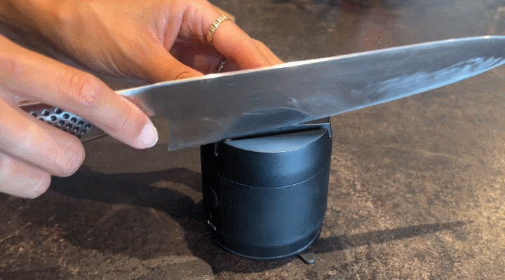 底面の吸盤が本体をしっかり固定するので、スロットに包丁を通すだけで完了。
