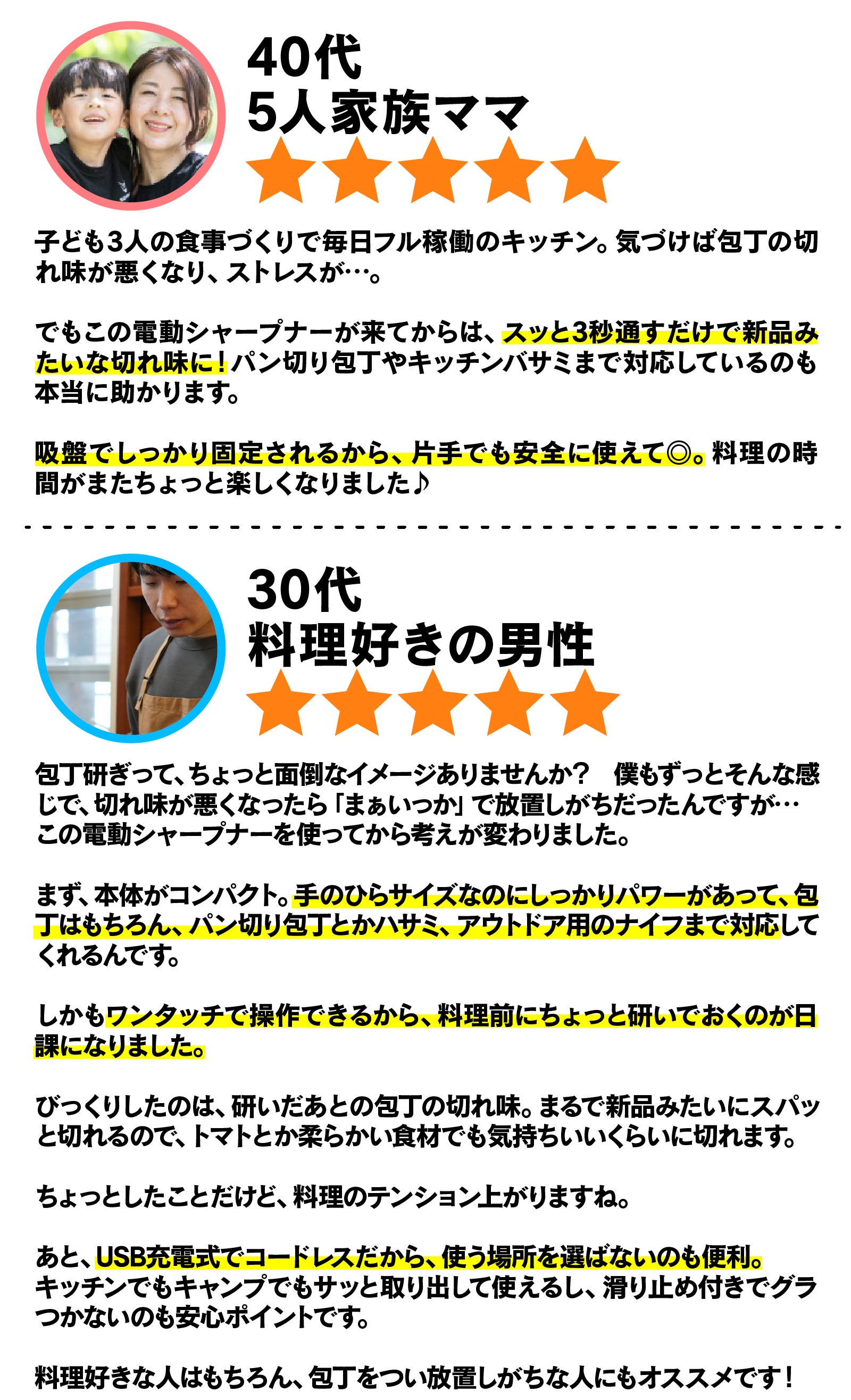 ボタン一つで、誰でも簡単に包丁やハサミ、さらにはパン切り包丁やアウトドアナイフまで研げる。その機能性に驚き、実際に試したときの「えっ、こんなに簡単に切れるようになるの!?」という感動は、今でも忘れられません。
