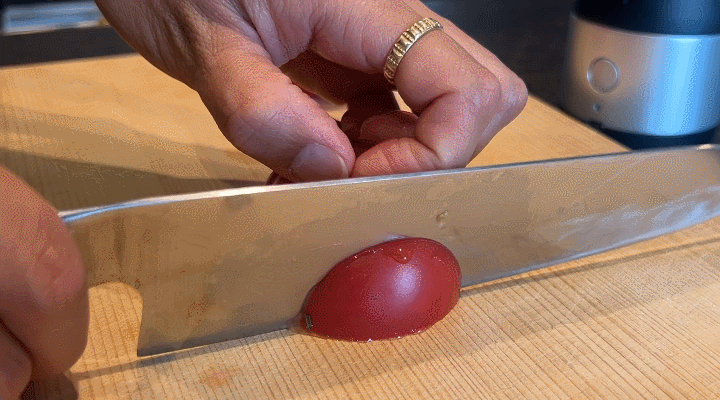 刃を入れると潰れてしまっていたのに、【Hiamea H1229】で研いだ後はまるでカミソリで切っているかのように刃がスーッと入り、しかも裏が透けるほど薄くスライスできます。