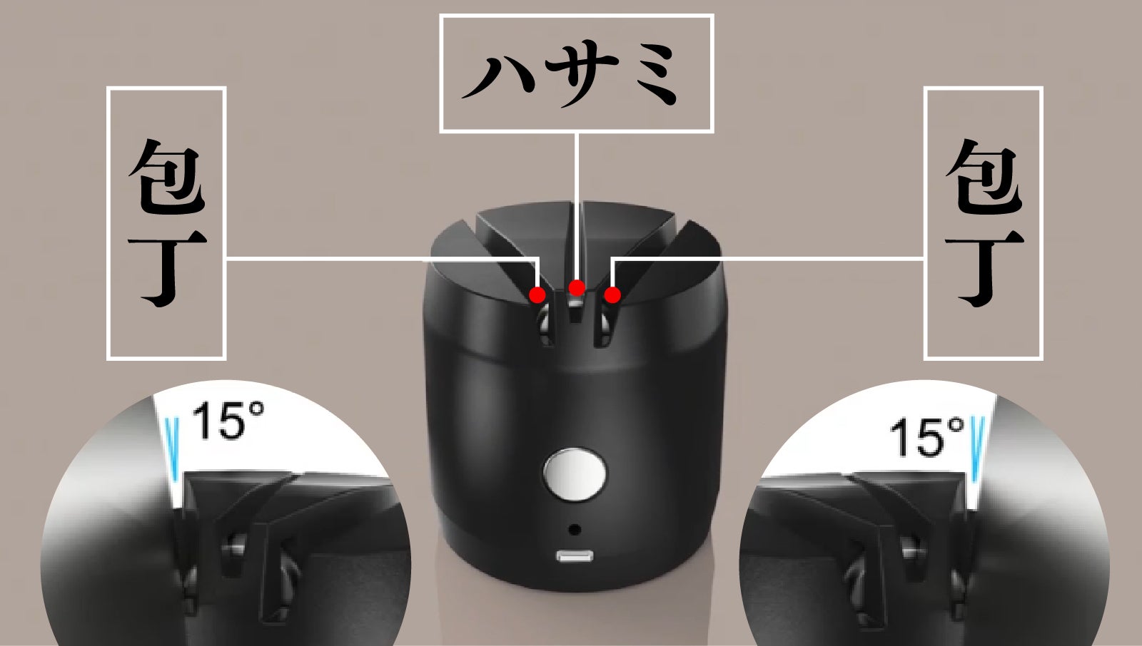 左右のスロットは包丁用で、刃角は切れ味と耐久性のバランスが取れる15度に設定されています。