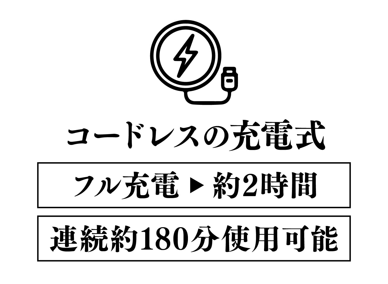 1回の充電時間は約2時間で、フル充電すれば連続で約180分も使用できます。