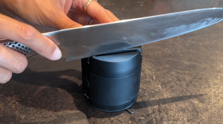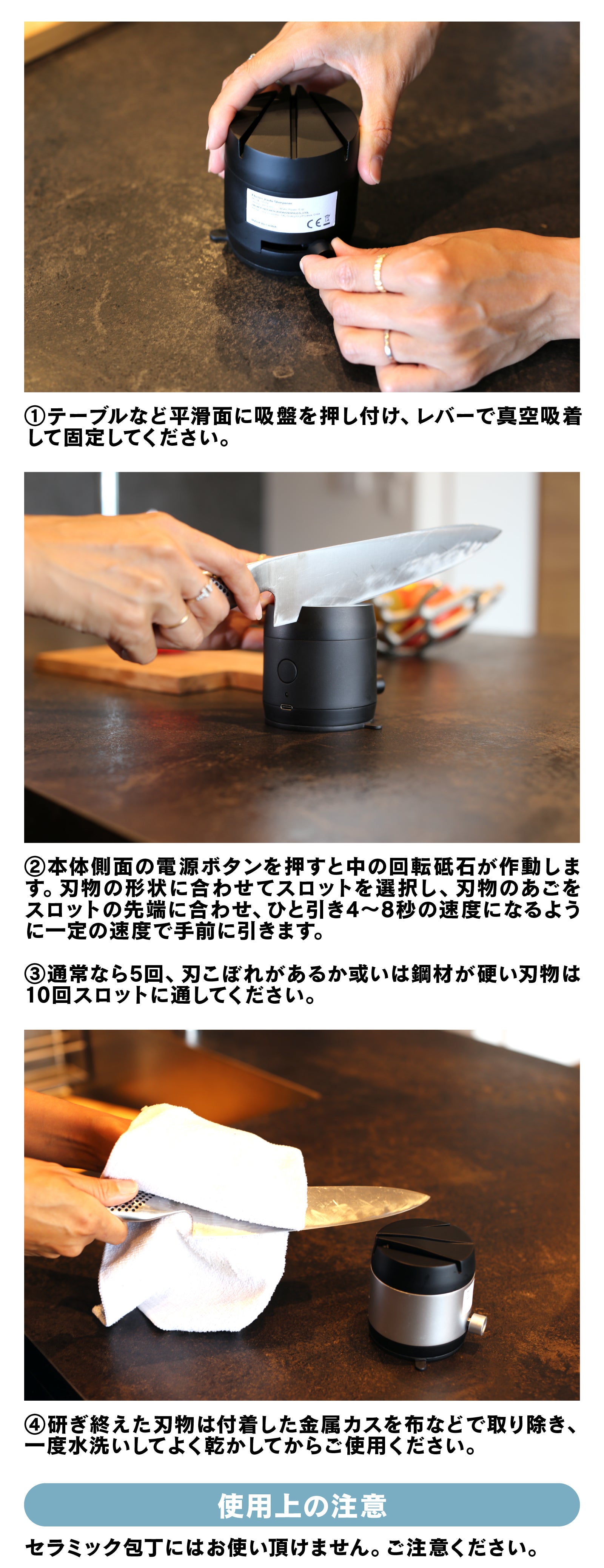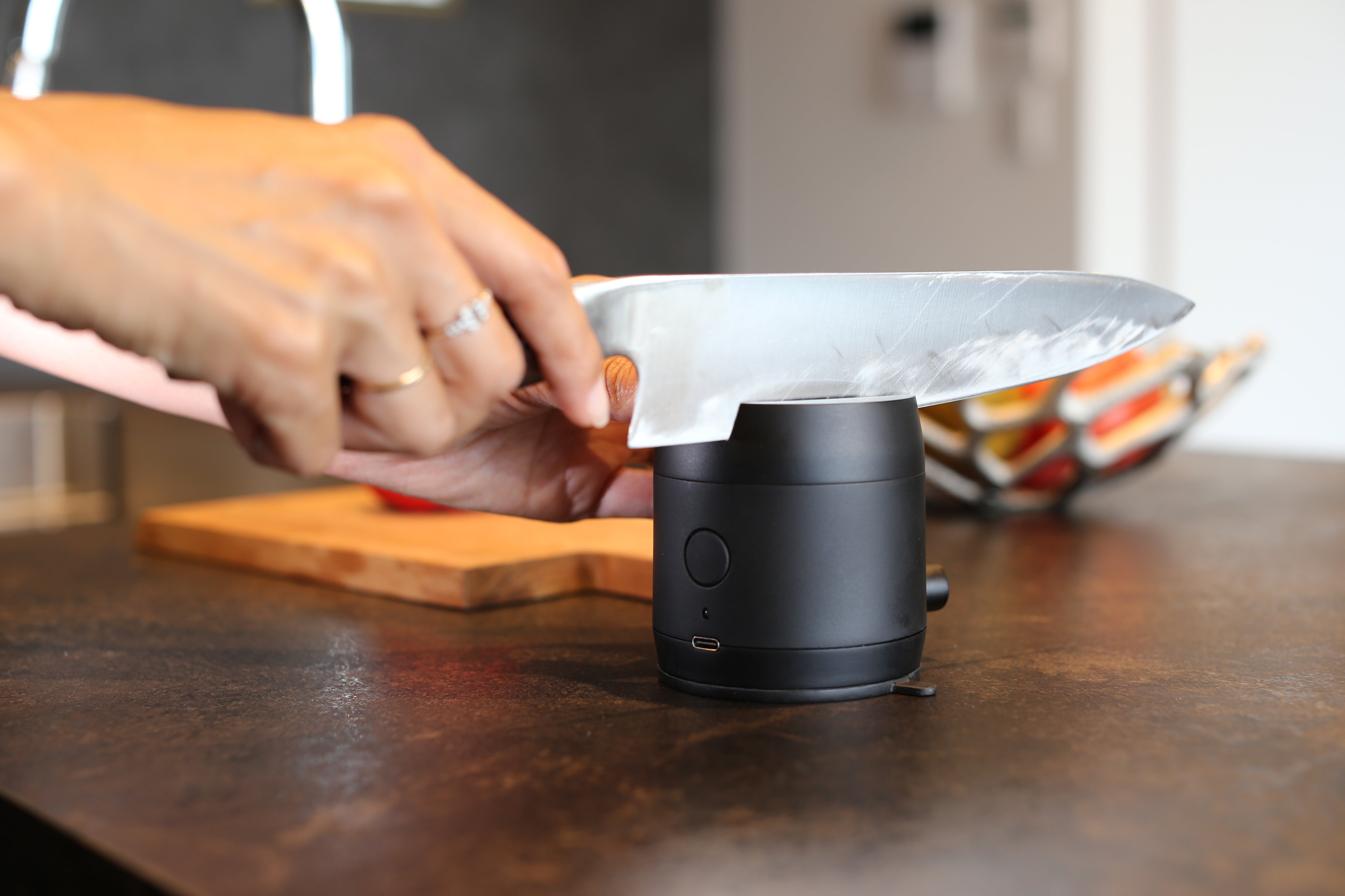 ボタン一つで、誰でも簡単に包丁やハサミ、さらにはパン切り包丁やアウトドアナイフまで研げる。その機能性に驚き、実際に試したときの「えっ、こんなに簡単に切れるようになるの!?」という感動は、今でも忘れられません。