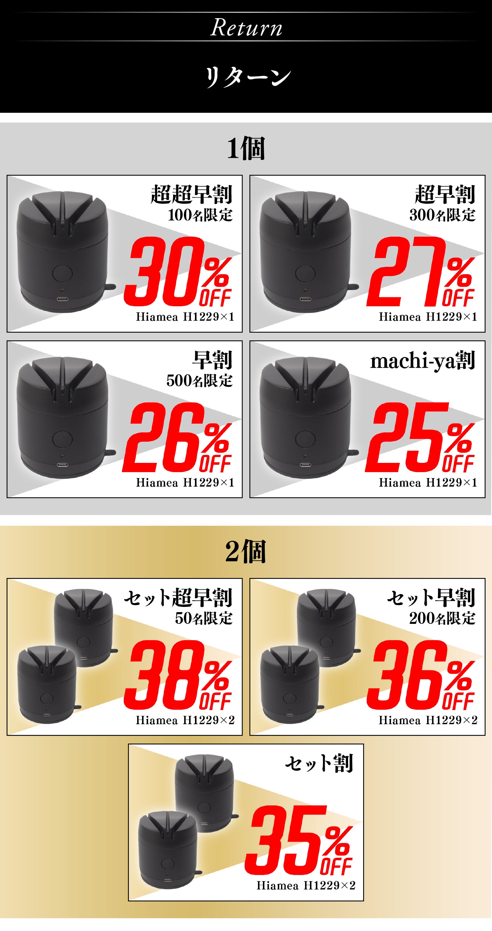2025/10/21 08:00ご支援者様Hiamea H1229 超小型電動シャープナー プロジェクトをご覧の皆様へこの度は、私たちのプロジェクトに温かいご支援・ご関心を賜りまして、誠にありがとうございました。おかげさまで、公開期間をもちましてクラウドファンディングを無事終了することができました。皆さまの一つひとつの応援が、私たちのチャレンジを支えてくださいました。ここに、心より深く御礼申し上げます。プロジェクト期間中、ご支援者の皆さまから頂戴したご期待を胸に、これから製造・出荷・お届けまで責任を持って進めてまいります。皆さまのお手元にHiamea H1229が届き、「切れ味が戻った!」という喜びを感じていただけることを、チーム一同楽しみにしております。今後も進捗状況やリターン発送状況を活動報告にてお届けしてまいりますので、どうぞご確認ください。引き続き、Hiamea プロジェクトを温かく見守っていただけますと幸いです。改めまして、皆様のご支援に心より感謝申し上げます。オスカージャパン株式会社Hiamea プロジェクトチーム一同 もっと見る