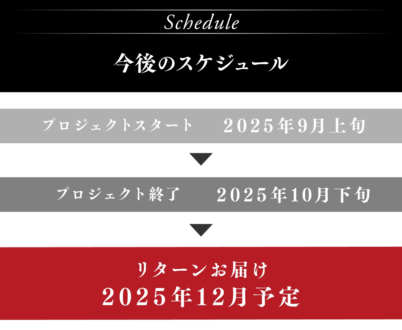 ※本文中に記載させていただいたスケジュールは、あくまでプロジェクト公開時点の予定です。クラウドファンディングの性質上、配送遅延のおそれがございます。原則として、配送遅延に伴うご支援のキャンセルはできませんが、リターン配送予定月から3ヵ月を超えた場合には、希望者に限りキャンセルにて対応させていただきます。