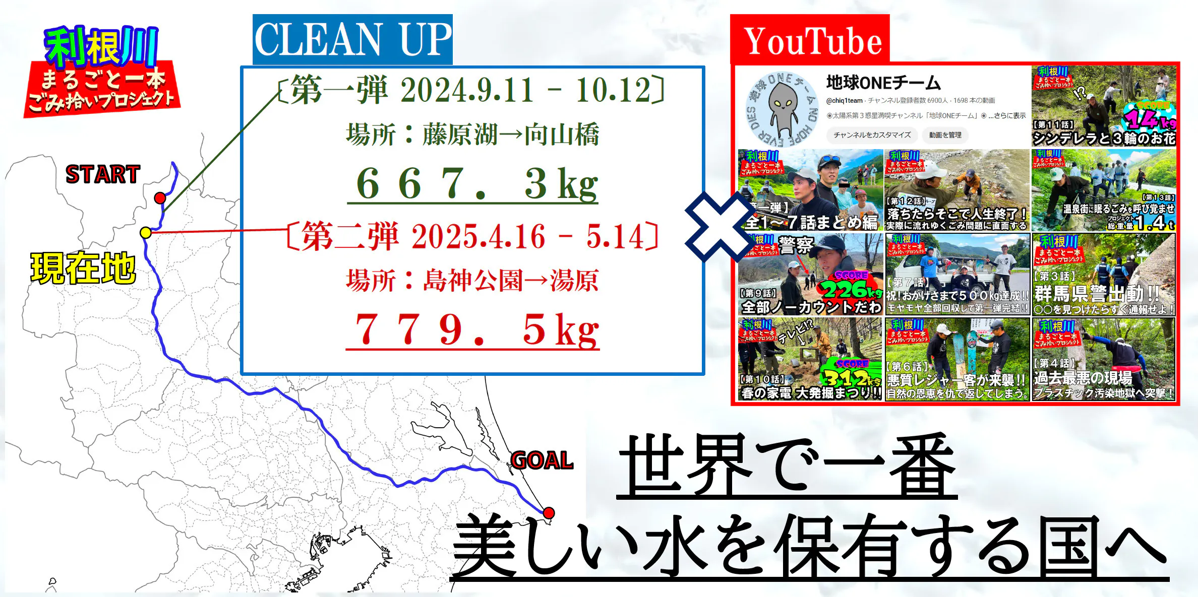ごみ拾いの実践と利根川の現状と活動を広げていくため、YouTubeチャンネル地球ONEチームにてその全貌を配信しています!