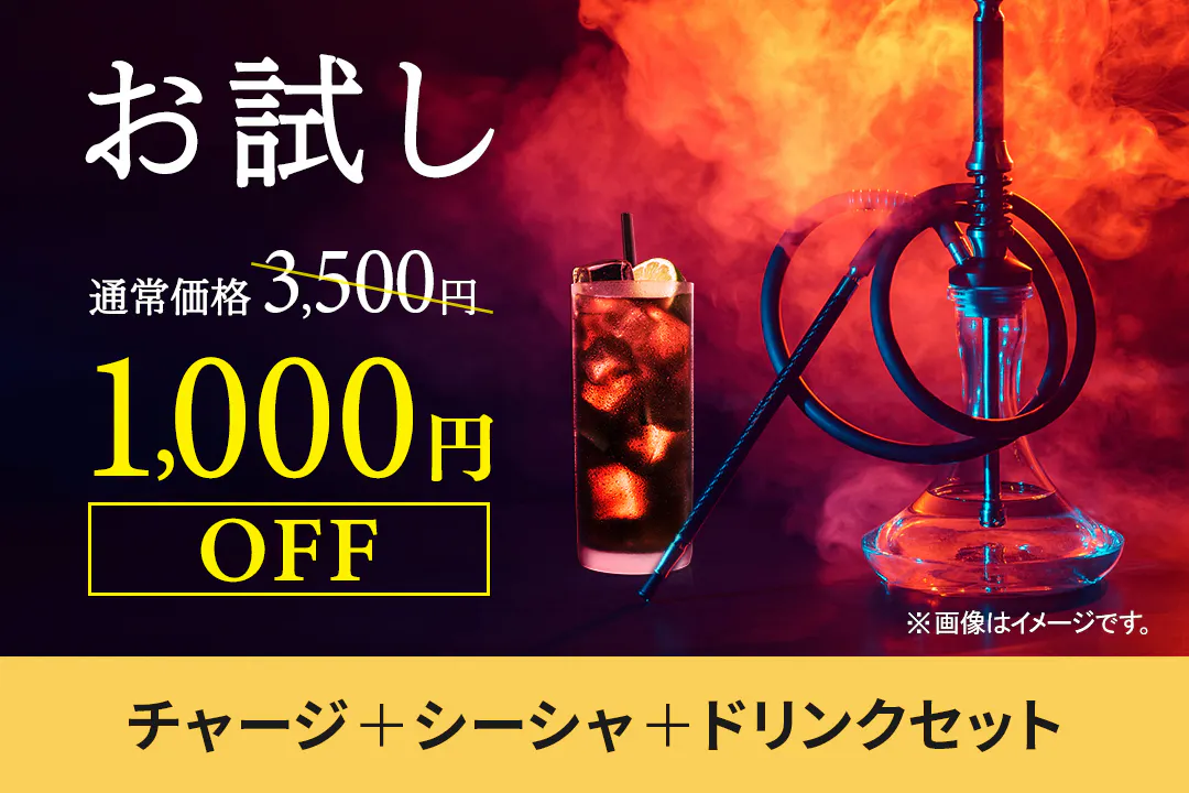 本来、3,500円相当のチャージ+シーシャ+ドリンクセットが2,500円で楽しめます。