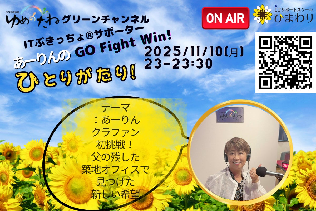 今回の投稿は、私がラジオパーソナリティとして担当している、インターネットラジオゆめのたねグリーンチャンネル「ITぶきっちょ®サポーターあーりんのGO Fight Win!」の11/10にオンエアーになりました、ひとりがたりの内容をお送りいたします。この日のテーマは、