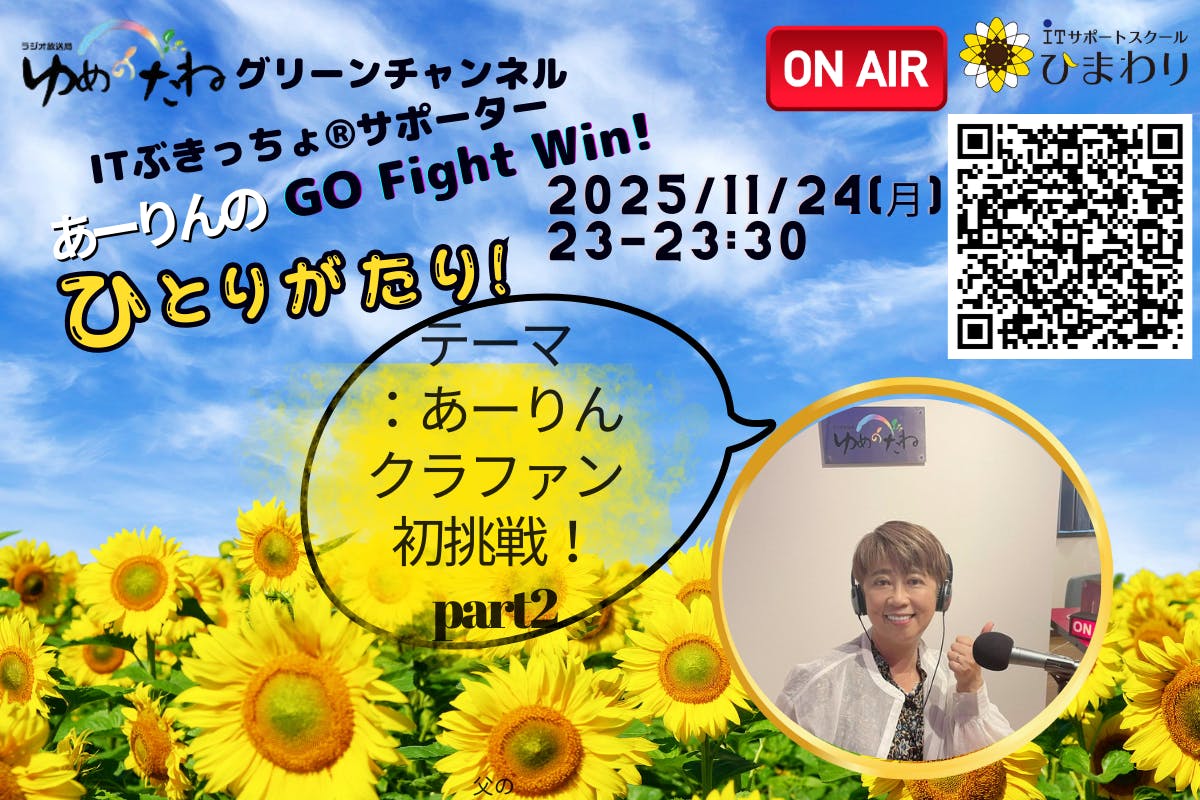 私は、ラジオパーソナリティとして、インターネットラジオゆめのたねグリーンチャンネル「ITぶきっちょ®サポーターあーりんのGO Fight Win!」を担当しております。番組のテーマは『恩送り』。頑張る方を応援する番組です。