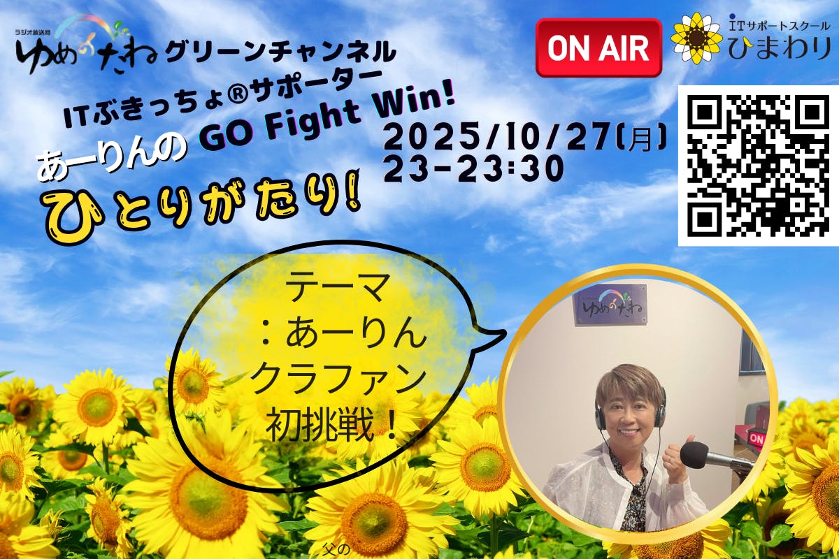 お世話になっております。お陰様で、11/13現在、38%達成となりました。10/30から始まったクラファンも残すところ15日となり、こうやって温かい応援とご支援をいただけますこと、本当にありがたいです。それに増して、亡き父が残してくれた築地オフィスを活かしていく責任の重みも感じます。私には、『日本中のITぶきっちょ®さんを救いたい!』という使命があります。このクラファンを通じて、その一歩に違づければと思っております。是非、ITの苦手な方の第一歩を押すきっかけとして、皆様に共感していただけましたら幸いです。私は、ラジオパーソナリティとして、インターネットラジオゆめのたねグリーンチャンネル「ITぶきっちょ®サポーターあーりんのGO Fight Win!」を担当しております。番組のテーマは『恩送り』。頑張る方を応援する番組です。今回の投稿では、10/27にオンエアーになりました、ひとりがたりの内容をお送りいたします。この日のテーマは、「クラファン初挑戦について」です。こちらをクリックしていただくと始まります。<番組の概要>クラファンを始めようとしたきっかけ▶亡き父の残した築地のオフィスについて▶亡き父の想い▶受け継ごうと思ったきっかけ▶私が今の仕事を始めたきっかけ▶クラファン活動への想いと展望是非、聴いていただきたく存じます♡日々感じること、私は色んな方々のご縁のお陰で生かされています。いただいたものを、ITサポートという形で、恩送りで頑張る方につなげていきたいと思います。中盤戦、頑張って参りますので、引き続きよろしくお願いいたしますm(__)mクラファンページはこちら