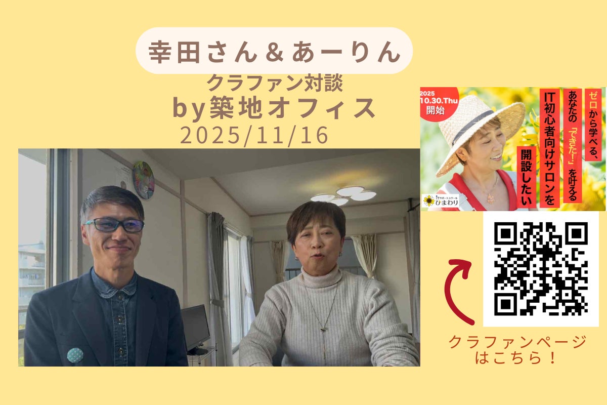四條邦夫さんをゲストにFBライブを行いました。テーマは『挑戦すること』について。動画はこちら四條さんが活動されてきた中で、「きっかけがあって、フェーズが変わるときに結果的に挑戦してきた」ということです。四條さんは、定年後に起業され、公私ともにエキサイティングな日々を送っていらっしゃいます。四條さんが大切にされていらっしゃることの中に、次のことがあります。幸せの三条件①やりたいことをやっている②それが人から評価されている③そして収入に結びついているチャレンジはしたけれど、決して無謀なものではなく、一歩ずつ確実に熟していく。その結果が今に繋がっている。やりたいことをして、感謝されて収入があった→「幸せの三条件」を満たしている。そこからWEB制作業に邁進されていらっしゃいます。社会貢献という視点で考えた時に、NPO法人セカンドワーク協会設立の流れになってきた。スモールスタートから、節目節目で、一つひとつの積み重ねをしてきた。果敢にチャレンジされてきた中で、応援することで、結果的に社会貢献となり、独りよがりにならない巡り巡っての今に繋がっている。ソフトアシスタンス株式会社という会社名は、『地元の企業の応援団』という意味が含まれています。「チャレンジする人を応援する!」という考え方は、正に私自身も共感すべき点です。今回、四條さんのお話をお聞きできる機会をいただけたことに心から感謝いたします。色んな方のお陰で、今の私が存在します。私の母が良く語る、『恩送り』という言葉が、私の源になっています。いただいたことを頑張る人にバトンを渡していく。それが、このクラファンでもあります。亡き父の残した築地オフィスを活かして、「ゼロから学べる、あなたの「できた!」を叶えるIT初心者向けサロンを開設したい !」そのクラファンも11/28終了まで、残すところ2日となりました。11/26現在、御支援が60%を超えました!ここまでこれたのも応援してくださる皆様のお陰です。本当にありがとうございます♡ラストスパートまで、全力で駆け抜けますので、引き続きよろしくお願いいたします。クラファンページはこちら