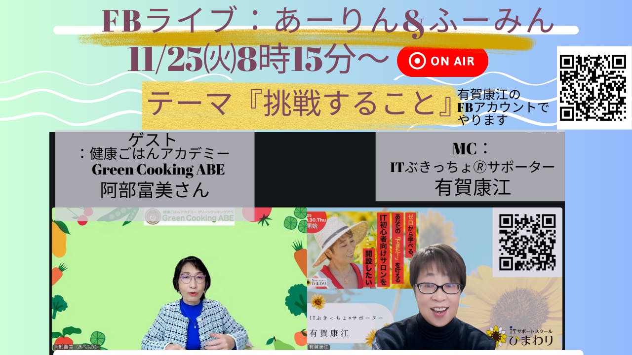 2025/11/27 14:00お世話になっております。10/30から始まったクラファンも本日11/27で1日となりました。おかげさまで、現在 305,400円/500,000円(支援者42名) までご支援が集まりました!本当にありがとうございます。今回は、11/25に行いました、公私ともに仲良くしていただいております、健康ごはんアカデミーGreen CookingABE主宰代表の阿部富美さんとのFBライブの様子をお送りいたします。阿部富美さんは、お料理のプロとして幅広い活動をされていらっしゃいます。いつも果敢に進まれる富美さんは、私の起業の先輩でもあり、尊敬しております♡その中で様々な挑戦をしていらしたことにスポットを当てて、お話しいただきました。動画はこちら私の起業のスタートは50歳を過ぎてからでした。起業してから色々な方に、ご縁をいただいてきました。それは私の財産です。とてもありがたいです。クラファンも残すところ1日となりました。日々改めて感じること、それは応援してくださる皆様への感謝の気持ちです。一言では語りつくせません。亡き父の残した築地オフィスを活かした、『ゼロから学べる、あなたのできた!を叶えるIT初心者向けサロンを開設したい』クラファンプロジェクトにご賛同くださいまして、心から感謝いたします。クラファンは間もなく終了となりますが、これで終わりではありません。クラファンを通して、学んだこともたくさんあります。何より、「日本中のITぶきっちょ®さんを救いたい!」というのが私の使命です。それを全うすべく、あーりん、かっ飛ばして参ります!引き続き、温かく見守っていただけますよう、よろしくお願いいたしますm(__)mクラファンページはこちら もっと見る