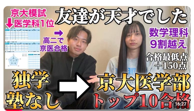 2026/01/13 19:53友達が教育系youtuberをやっていて、出演させてもらいました。動画では過去の栄光のように自分語り多めですが”親の先行投資” ”恩師、友達との出会い”があってからこその合格でした。感謝しかありません。両親の偏差値も40以下と決して勉学とは程遠い一般家庭でしたが、最後には大学合格という形で一つ親孝行できたと感じております。リターンでは教育相談や実際の勉強方法などyoutube以上に詳しく、ニーズに合わせて話せていければと考えています。アメリカの臨床留学への挑戦、ぜひ支援していただけるとありがたいです。 もっと見る