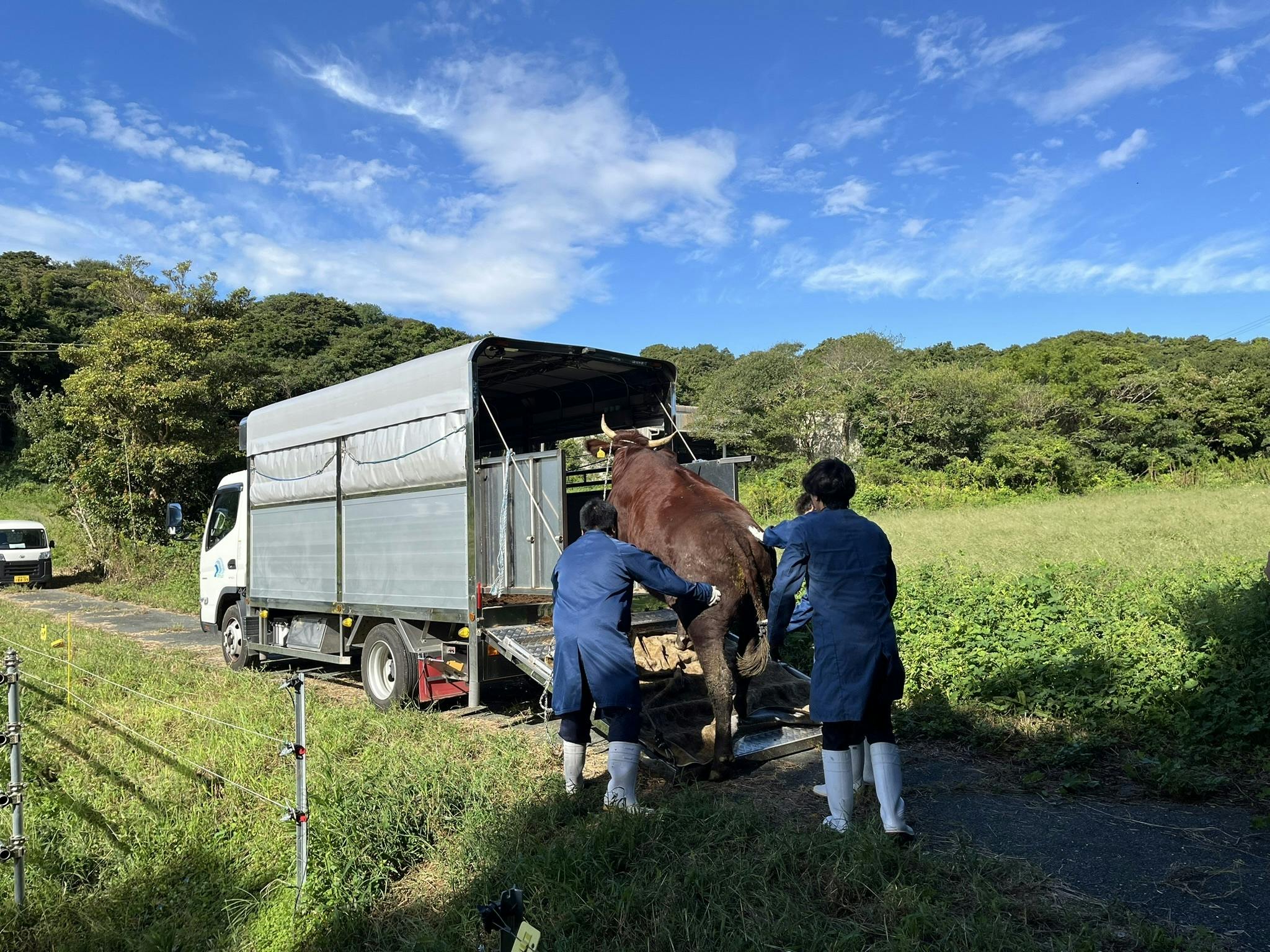 今朝、オアシスファームとして初めての牛の出荷を行いました。朝8時半にJAの皆さんがトラックできて無事に積み込みを終えました。積み込みの際、牛が興奮して暴れることもよくあるそうです。暴れると肉色まで黒く変わってしまうそうで心配をしていましたが、おとなしくトラックに乗ってくれました。