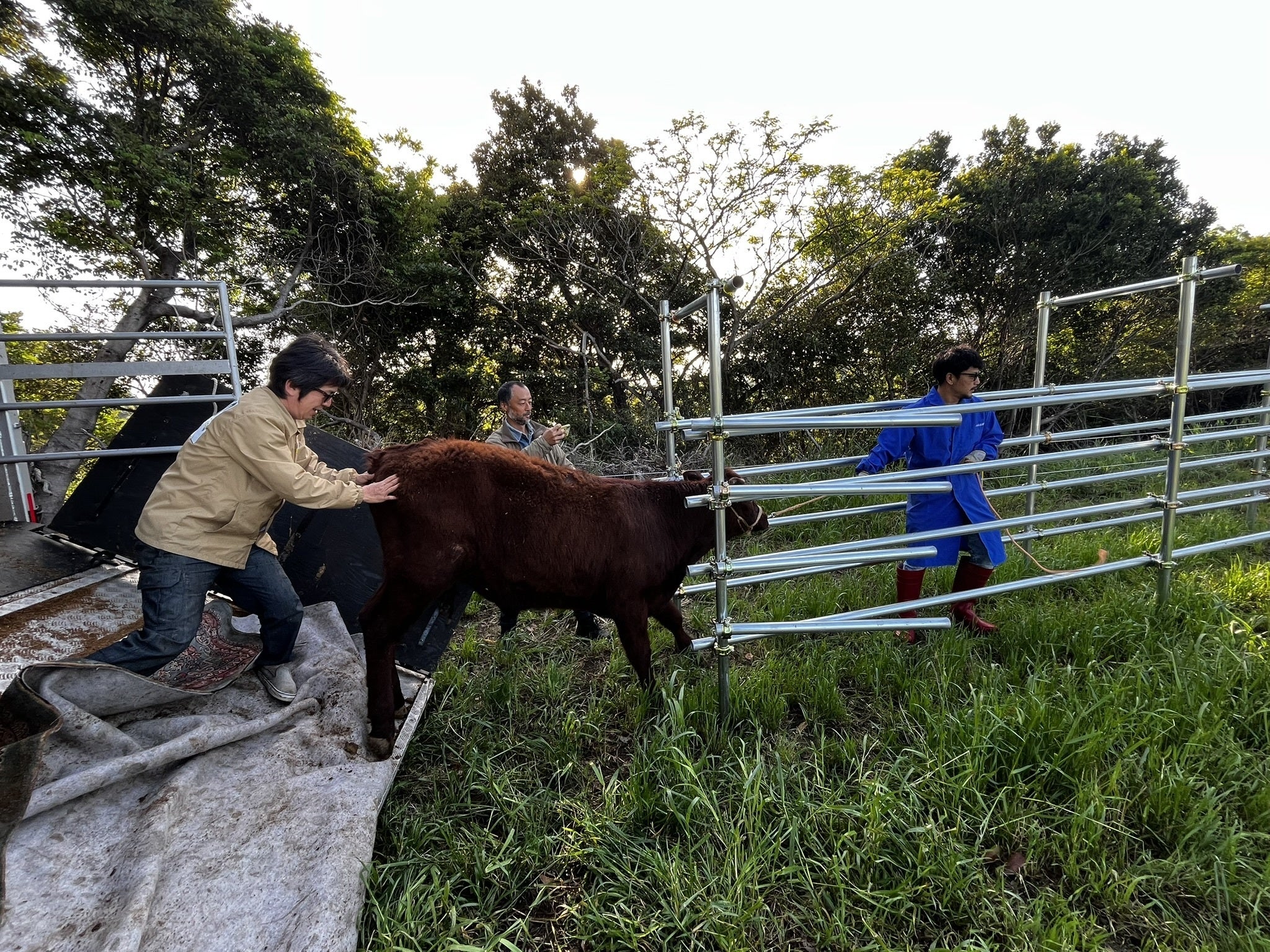 そして、4月26日の早朝、3頭の子牛たちが整備されたばかりのオアシスファーム第3牧場へやってきました。北海道から茨城を経て愛知へ。トラックに揺られて3日間の長旅です。今回の牛たちも、到着してすぐに、スムーズにトラックから降りて牧場に入ってくれました。お腹ががすいていたようで、すぐにパドックの中の草を食べていました。適応能力の高い頼もしい牛たちです!最初の1日はパドック内で電気牧柵の馴致を行います。ちょっとかわいそうですが、狭いところに入れて電気牧柵は「ビリっ」とすることを牛に学習してもらいます。電気牧柵は物理柵ではなく心理柵だといわれます。体当たりすれば牛には容易に倒すこともできる柵ですが、心理的に怖いと思うことでこれを避けるようになります。ただ、様子を見ていると、電気牧柵については十勝の出身牧場で学習済みのようで、上手に避けてくれている様子がうかがえてホッとしました。