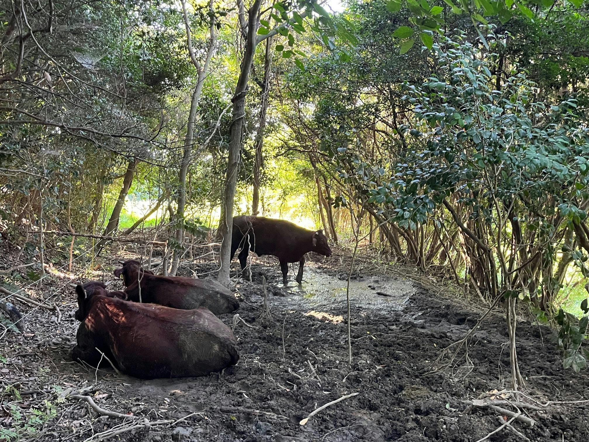 北海道生まれの3頭の短角牛。当時は約10カ月齢で体重が300キロでした。できるだけ自然に近い草地が理想なので牧草の種は利用していませんが、短角牛といえども好き嫌いはあるようで、見ていると特定の草が食べ残されています。それでも、彼らが草を食べる量はすさまじく、電柵で牧区をわけたときのビフォー&アフターの様子には驚くばかりです。日に日に草むらが牧場らしくなっていきます。森も、最初は枝が生い茂って私たちが入るのも一苦労でしたが、牛が自分たちで道を踏み固めることで整備されていきます。