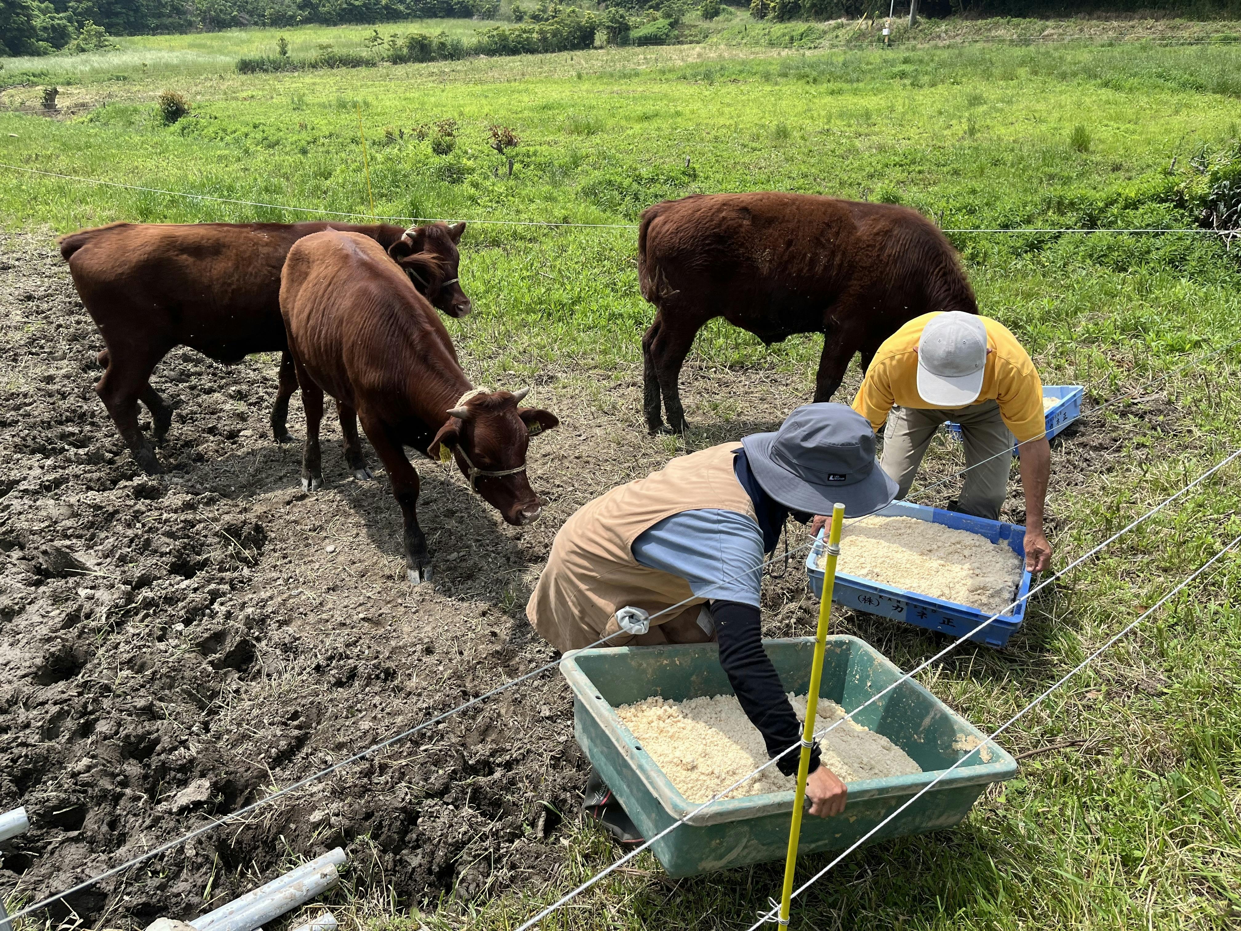 私たちの仕事は1日に1回「おやつ」を運ぶこと。そのときに「おやつ」を食べる牛たちとコミュニケーションをとりながら体調を観察しています。給餌の作業が少ない分、ニワトリの飼育よりも作業時間が少なくすんでいます。あとは、夏に電気牧柵が漏電しないように下草を刈ったりする作業も重要です。