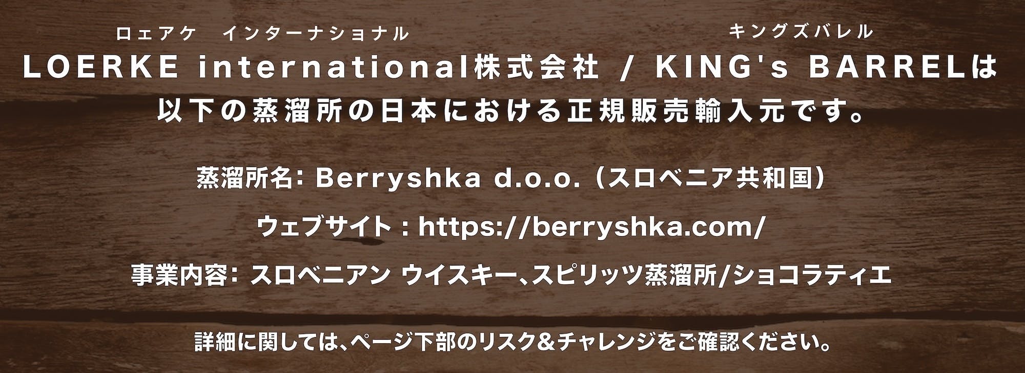 ドイツと北欧のウイスキーとスピリッツの美味しさと各蒸溜所が持つ素晴らしい物語に惚れ込んで、日本ではまだ知られていないハイクオリティで美味しいお酒を取扱うLOERKE international株式会社は、KING's BARREL(キングズバレル)という名前で、未知の美味しいお酒が待つ世界への扉として、日本に住むすべての皆さんと一緒にその扉を開いて美味しいお酒を探求する旅に出かけようというコンセプトのもと、独自に選び抜いた自らが美味しいと思ったお酒のみを各蒸溜所/メーカーより直輸入し、日本総輸入元として蒸溜所と二人三脚で国内での卸と小売を行ってきました。