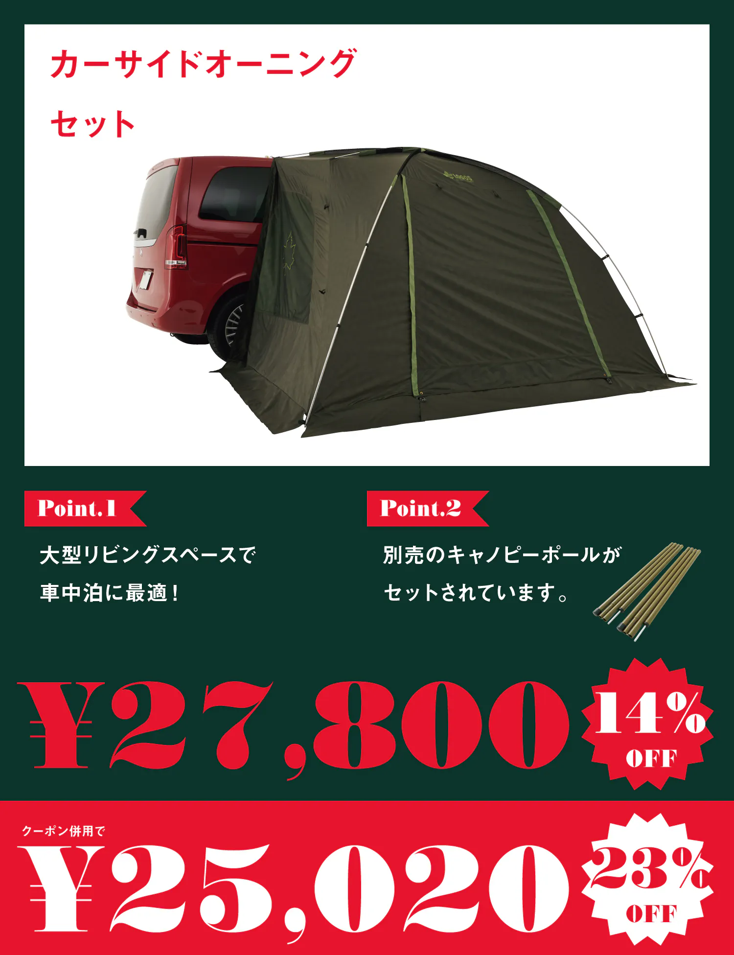 2025/08/22 18:15こんばんは!ロゴスコーポレーションです。「CAMPFIRE限定!8月末までに発送!夏のSALE開催!」プロジェクトですが終了まで残り5日となりました。本日は「neos ALカーサイドオーニング-BB」について詳しくご紹介させていただきます!↓neos ALカーサイドオーニング-BBの公式HP情報はこちら↓https://www.logos.ne.jp/products/info/3891軽自動車から大型のミニバンまで対応軽自動車のハイトワゴンやスーパーハイトワゴン(車高170cm以上)から、大型のミニバン(車高190cmまで)にも取り付け可能です。※快適にお使いいただくために、車高170cm以上の車に取り付けることをおすすめします。大型リビングスペースで車中泊に最適!持ち運びや設営時に便利な軽量アルミフレームを使用。錆びにくく丈夫です。付属のジョイントで簡単に車体とリンクすることができて、連結時は3方向から出入り可能。お手軽に空間をひろげられるので、車中泊の際にとても重宝します。3方向から出入り可能な大型リビングスペース車とタープの行き来がスムーズなワイドタイプ。大型リビングスペースを確保できるので車中泊に最適です。正面、サイド2箇所の3方向から出入りが可能です。プロジェクトは8月24日(日)まで。皆様のご支援心よりお待ちしております! もっと見る