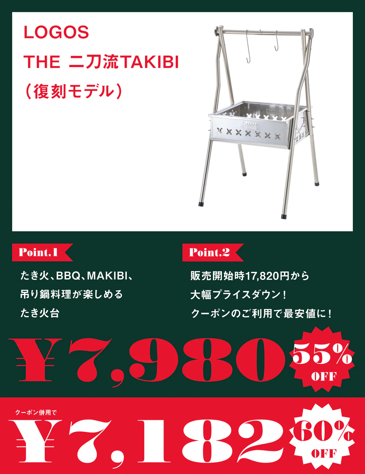 LOGOSを代表したグリルのひとつ、「二刀流グリル」がたき火台として復活!たき火はもちろんのこと、付属の焼き網でBBQ、付属のフックでMAKIBI吊り鍋料理が楽しめます。たき火の薪が組みやすい正方形の火床で、鍋やダッチオーブンをムラなく効率的に加熱、調理できます。燃焼効率をUPするロストルも付属しています。