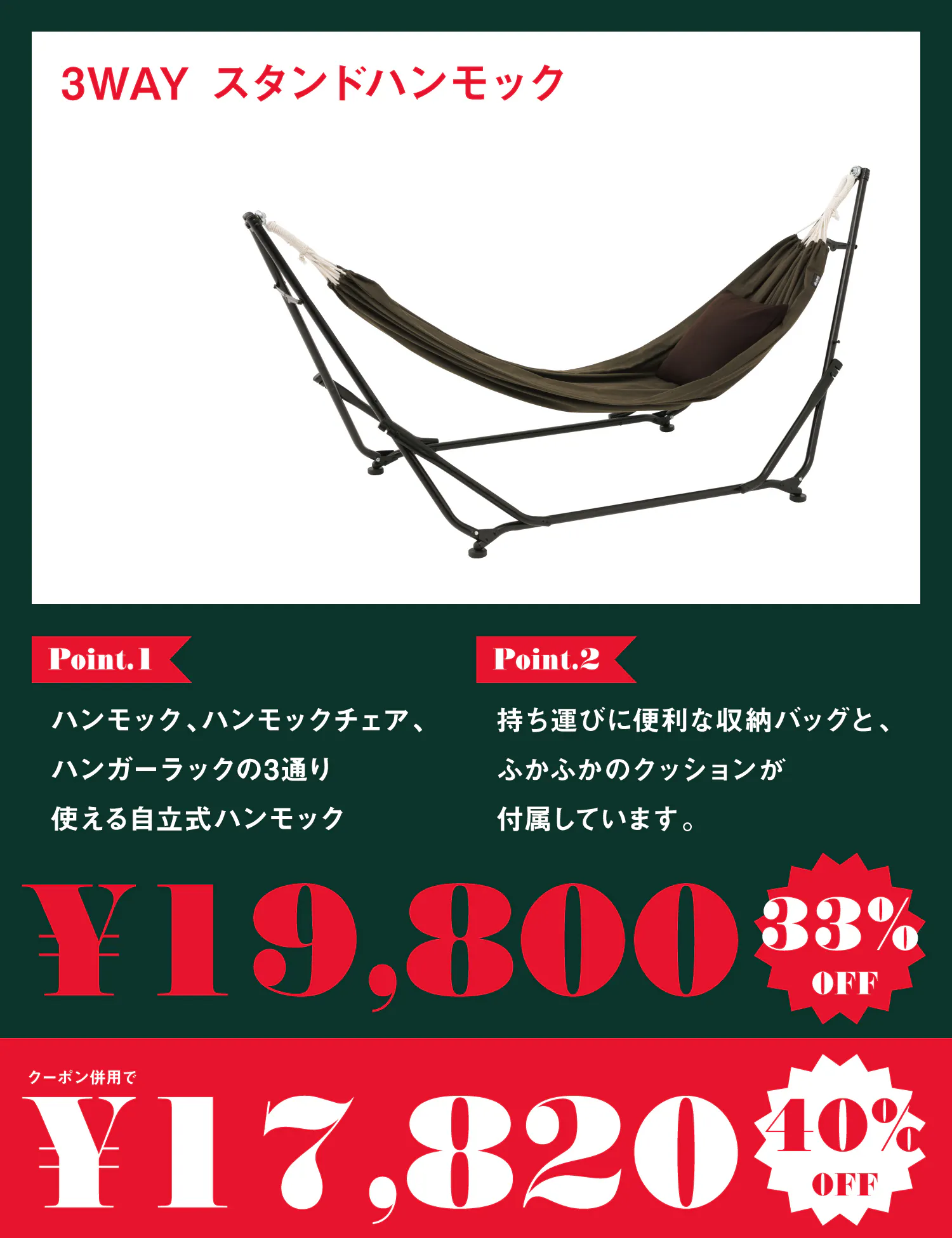 フレームを調節し、生地を付け替えるだけで「ハンモック」「ハンモックチェア」2パターンのくつろぎスタイルが完成。また、支柱を取り付けると「ハンガーラック」に早変わり。3WAYの使い方ができるユニークなアイテムです。肌ざわりのよいコットン生地や、快適なスウィングを生みだすベアリング式フックなど、ハンモック本来の使い心地にもこだわりました。持ち運びに便利な収納バッグと、ふかふかのクッションが付属しています。★耐荷重(約)100kg
