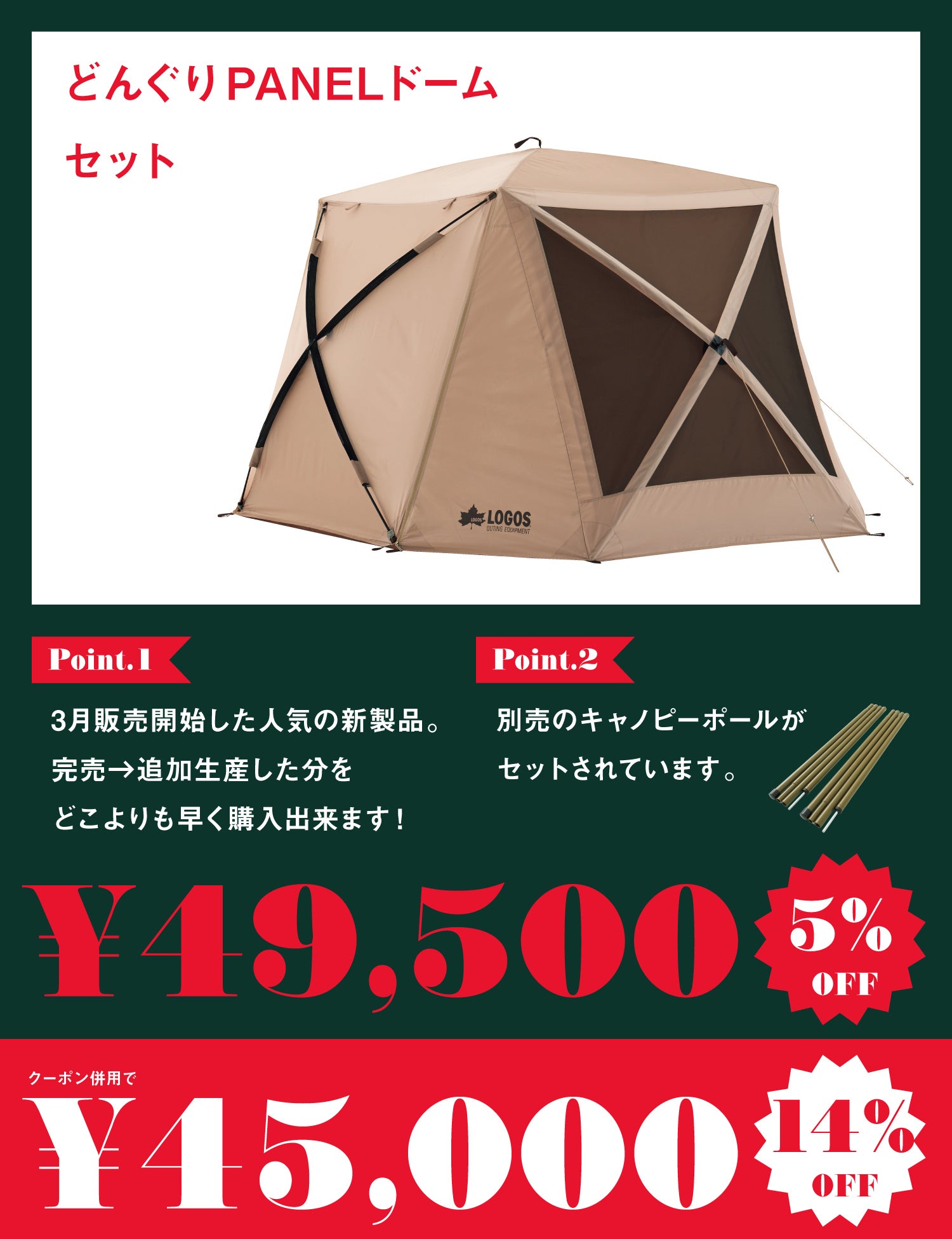 ※キャノピーポールは上記の「Tradcanvas どんぐりPANELドーム 260」に同梱して、1個口で配送させていただきます。
