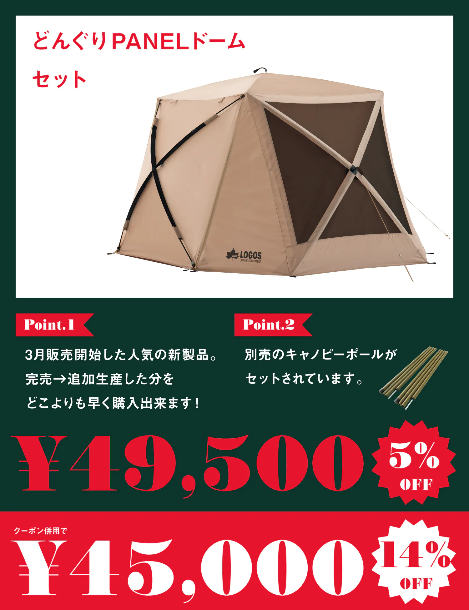 2025/08/19 18:30こんばんは!ロゴスコーポレーションです。「CAMPFIRE限定!8月末までに発送!夏のSALE開催!」プロジェクトですが終了まで残り5日となりました。本日は「どんぐり PANELドーム 260-BE」について詳しくご紹介させていただきます!↓Tradcanvas どんぐり PANELドーム 260-BEの公式HP情報はこちら↓https://www.logos.ne.jp/products/info/11338簡単組立て90秒&撤収も楽々!パネルの中心部分を引っ張るだけで簡単に組立てられます。シートとフレームは一体化しているため、パーツの紛失もありません。パネルの中心部分を押せば簡単に撤収できます。パネルを引っ張るだけ!耐風性に優れたスクリーンドーム。複数のパネルで構成された幅260cmの大型ドーム。シートとフレームが一体化しているため、パネルを引っ張るだけで約90秒で設営可能です。耐風性にすぐれた構造に加え、丸みのある形状なので居住性も抜群。強い日差しを遮るサイドウォールも付属しています。日差しを遮るサイドウォール付き面ファスナーで着脱が簡単なサイドウォール×3面付き。強い日差しも遮ります。通気性に優れた大型メッシュ窓3面の大型メッシュ窓で通気性も抜群。また、今回特別セットとして「スタンダードキャノピーポール180(2本セット)」も付属しています!↓スタンダードキャノピーポール180(2本セットの公式HP情報はこちら↓https://www.logos.ne.jp/products/info/5158プロジェクトは8/24(日)までです。皆様の応援お待ちしています!! もっと見る