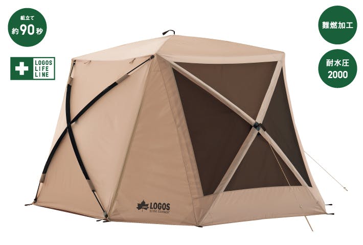複数のパネルで構成された幅260cmの大型ドーム。シートとフレームが一体化しているため、パネルを引っ張るだけで約90秒で設営ができます。耐風性にすぐれた構造に加え、丸みのある形状なので居住性も抜群。強い日差しを遮るサイドウォールも付属します。