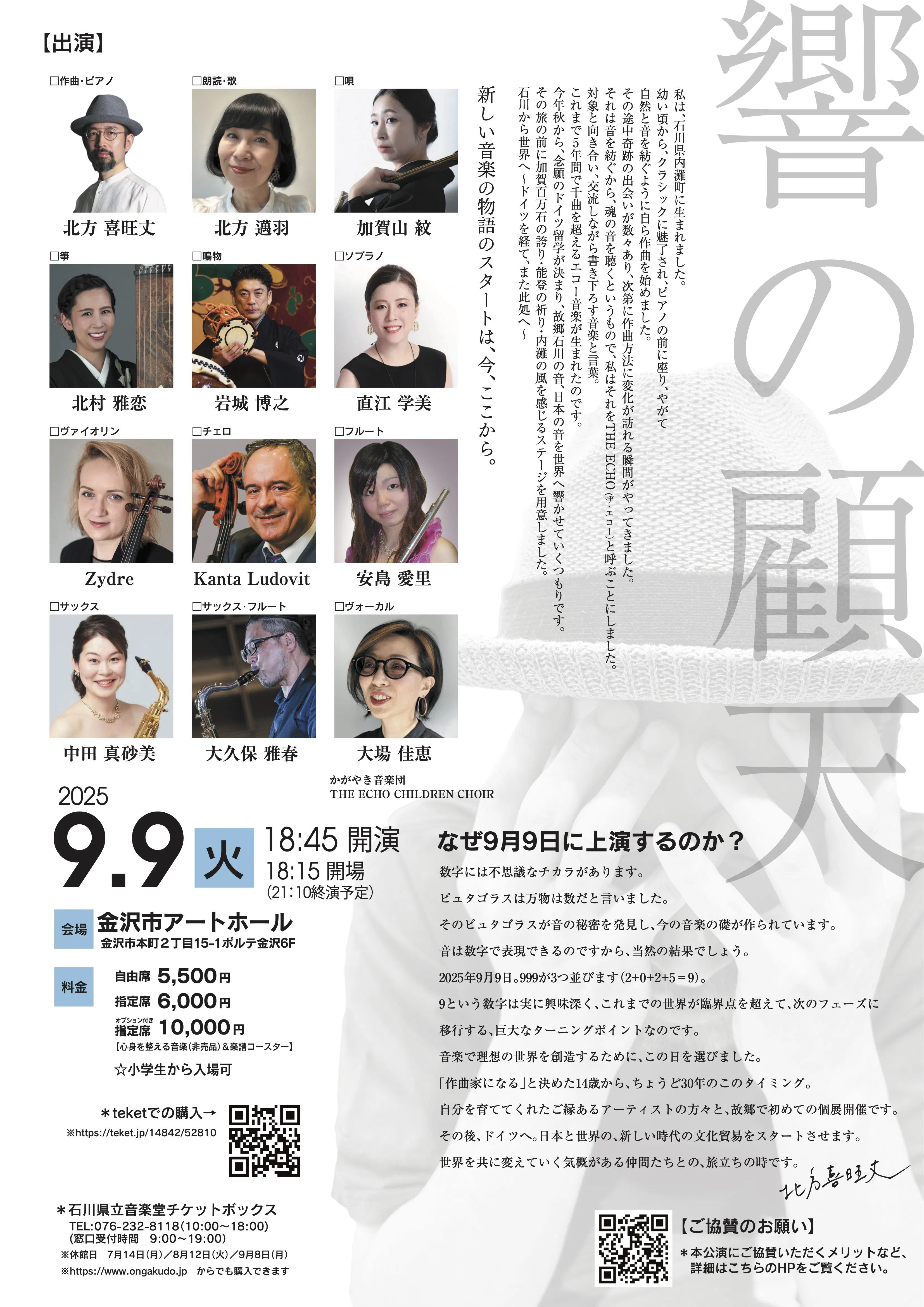 更に、これまでほとんど国内のみで活動を続けてきましたが、2025年秋から拠点をドイツに移します。より本質的で深く音楽の研鑽を積むこと、国内外でより貢献、創造を進めていくことが目的です。そこで日本を離れる前に、これまでの集大成として、地元石川県を軸にしたコンサートを企画しました。