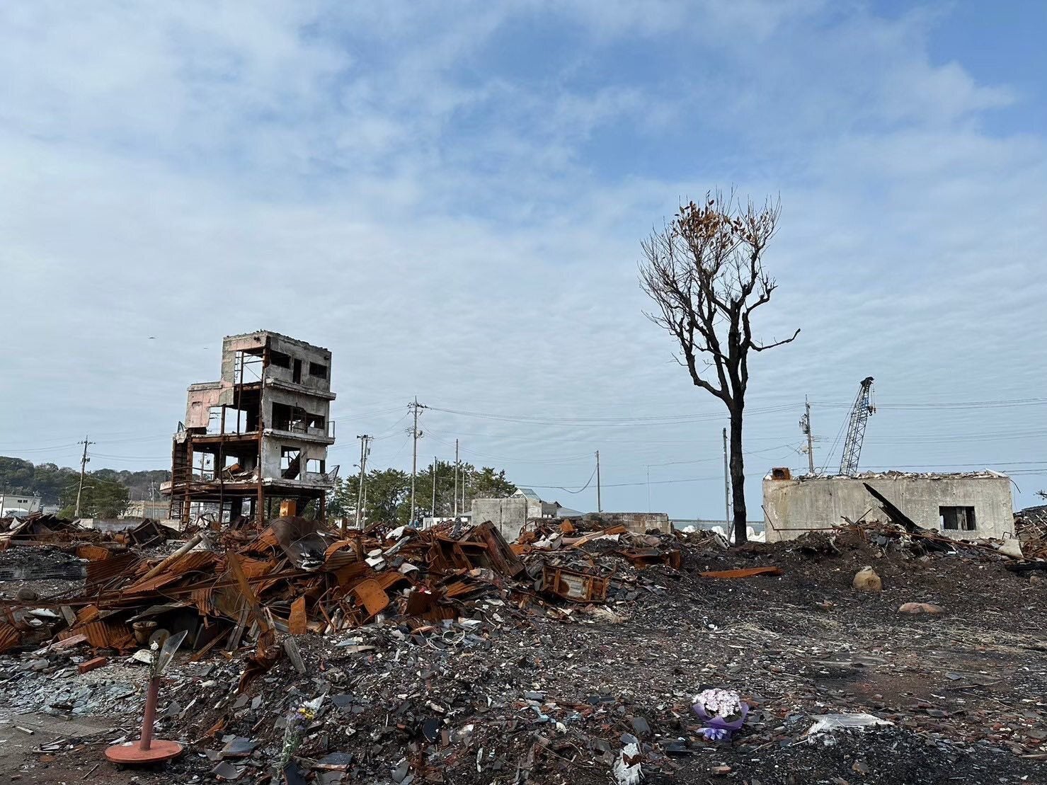 震災から数ヶ月後、北方さんと私がその地を訪れたとき、そこには焼け焦げた匂いがまだ残り、静かで重い空気が流れていました。 かつて多くの人で賑わい、活気に満ちていた場所が、変わり果てた姿になっていたのです。
