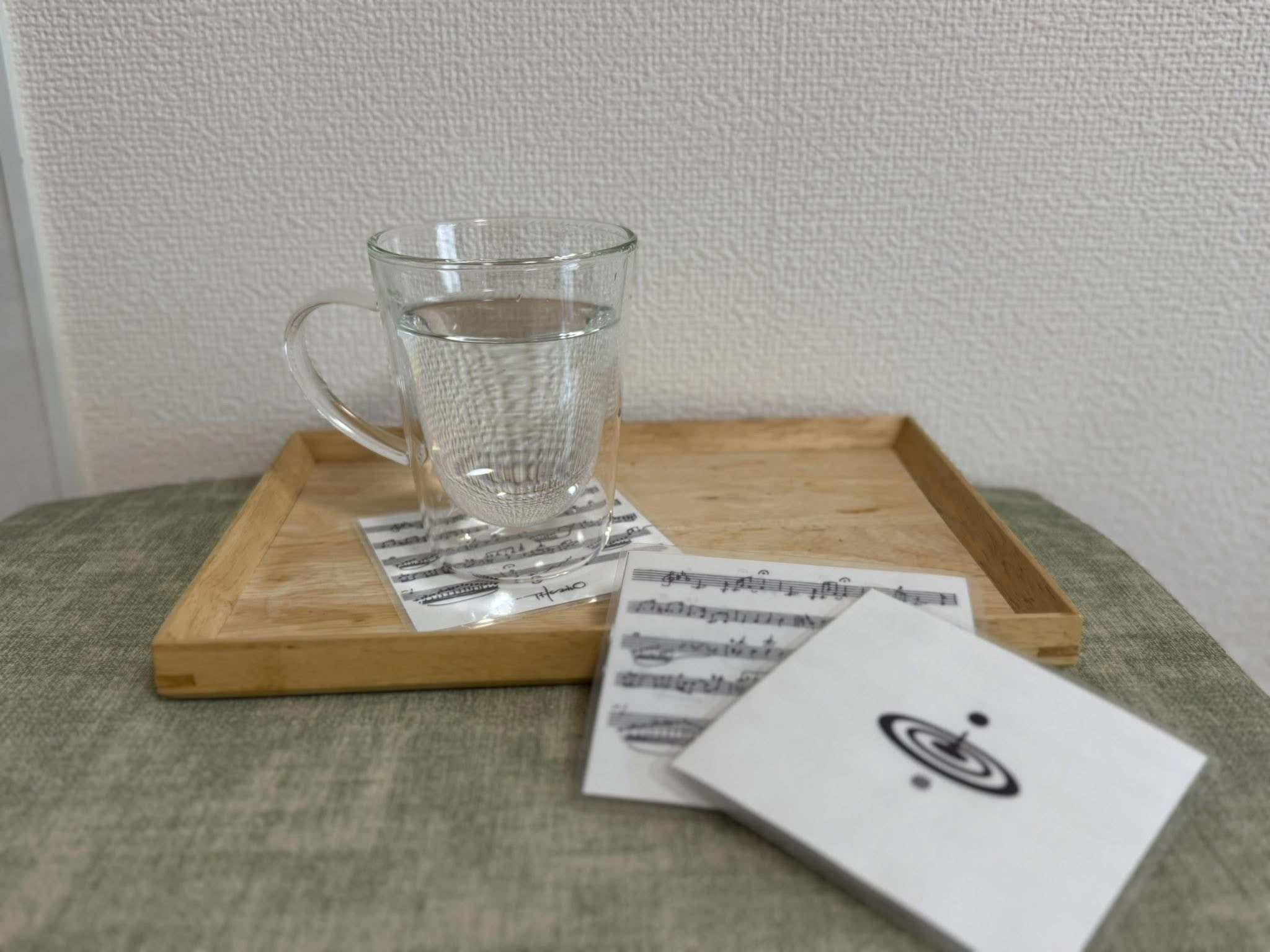 コースターへのこだわりは実用性だけでなく、ディスプレイとしてもお使いいただけるものを届けること。能登の木材を活かし、「THE ECHO」の楽譜を印字することで、能登の地のエネルギーを皆様に味わっていただきたいという願いが込められています。