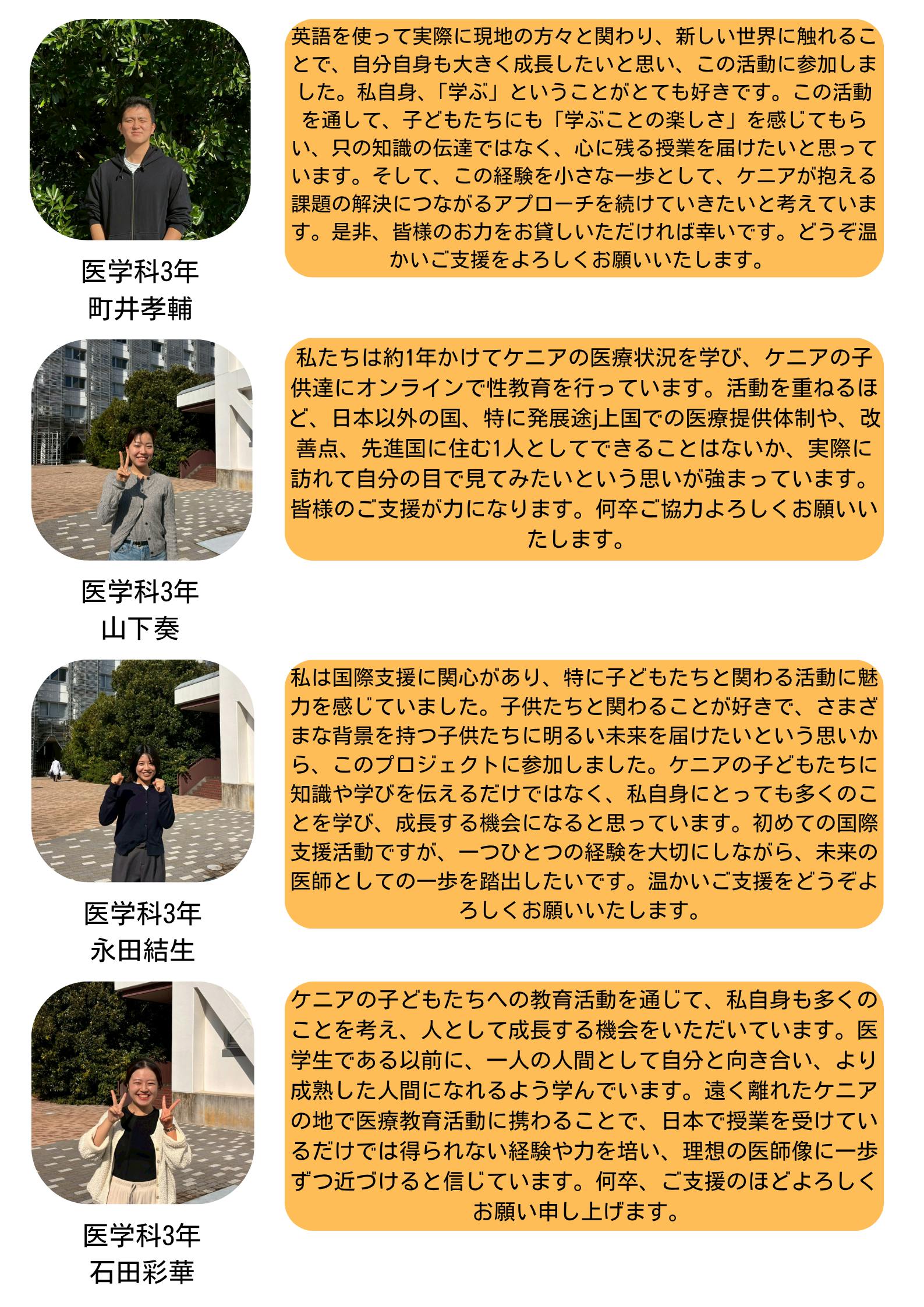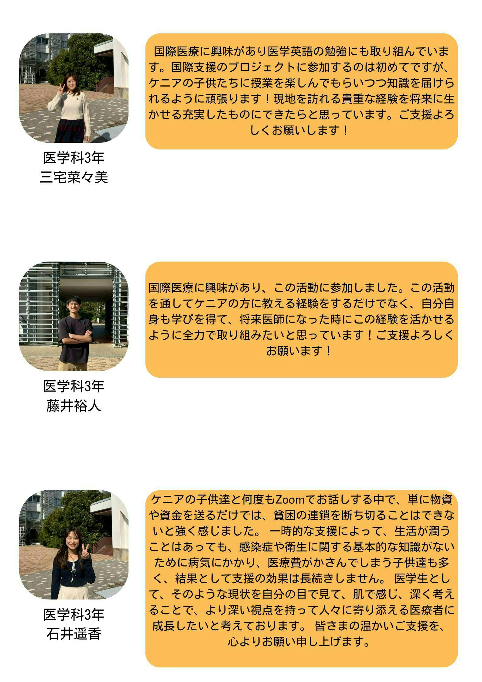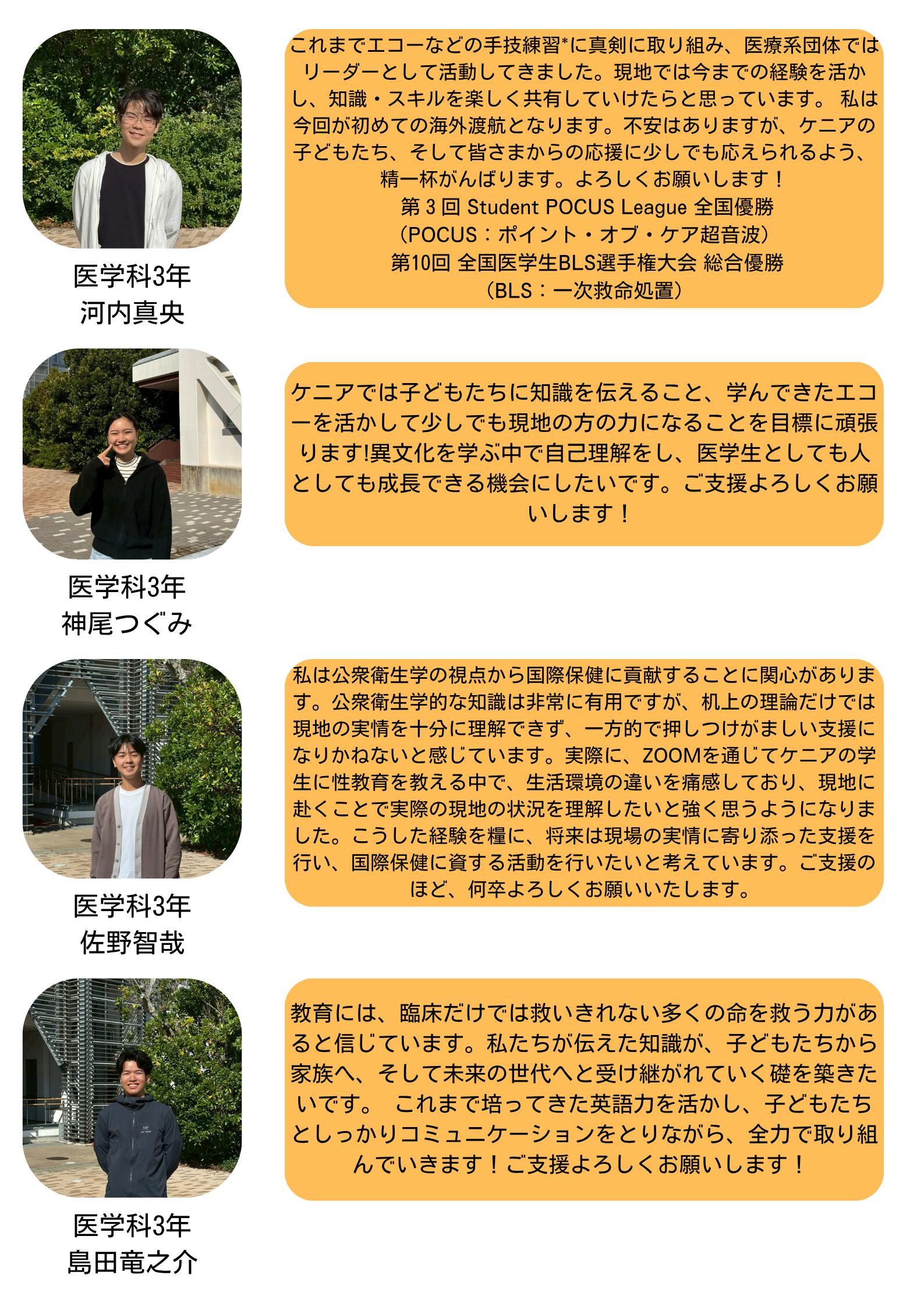 それは医療の世界でも同じです。医師の仕事は患者さんを診察するだけではありません。公衆衛生など予防法を広く伝えることも重要ですし、治療後のフォローアップも大切です。このような活動に学生のうちから取り組むことで、将来の医療をリードする医師を目指します。昨年活動された先輩方も、ケニアを実際に訪問したことで考えや行動に変化が生まれ、帰国後も様々な場面で活躍されています。今年の1月からは日本での臨床実習を始められました。