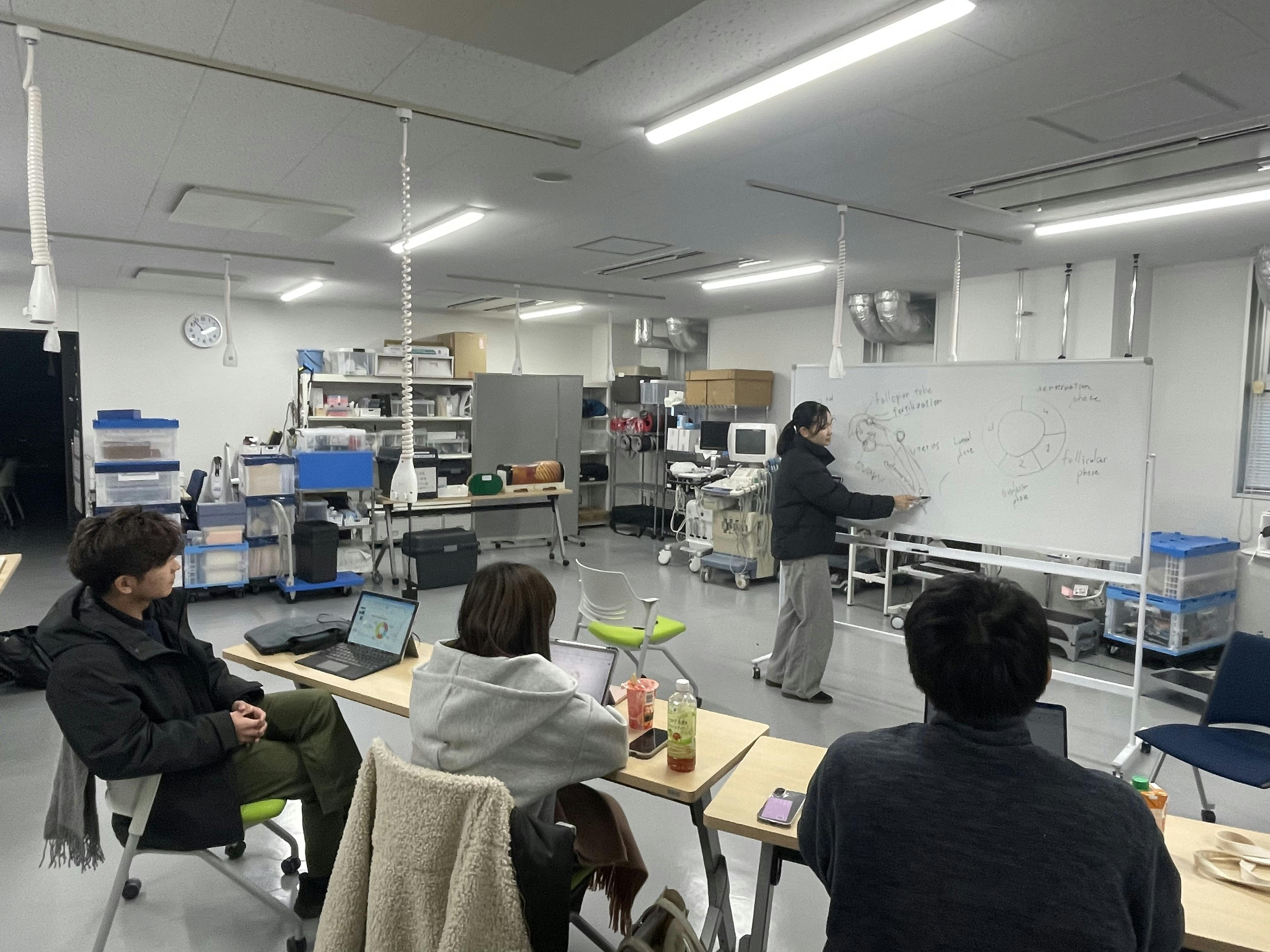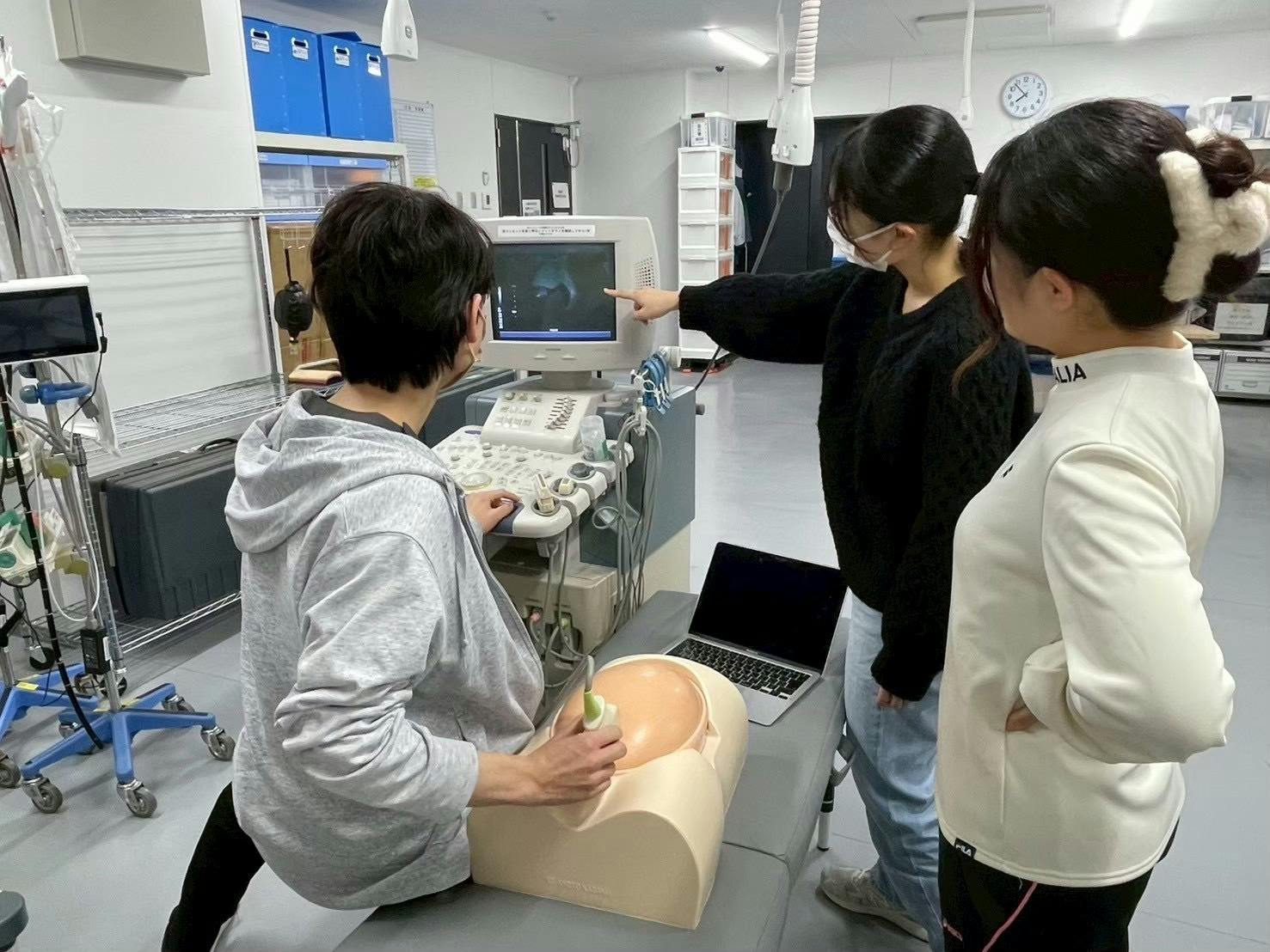 毎週放課後には実際のエコーを用いた練習会で基本手技を反復し、併せて症例の勉強会も行ってきました。また実際の病院やクリニックに訪問し、産科エコーやPOCUS(患者の傍らで医療従事者が行う、日常診療・短時間のエコー検査の総称で、専門外でも一定の訓練で習得可能なスキル)のエコーの実習も行いました。