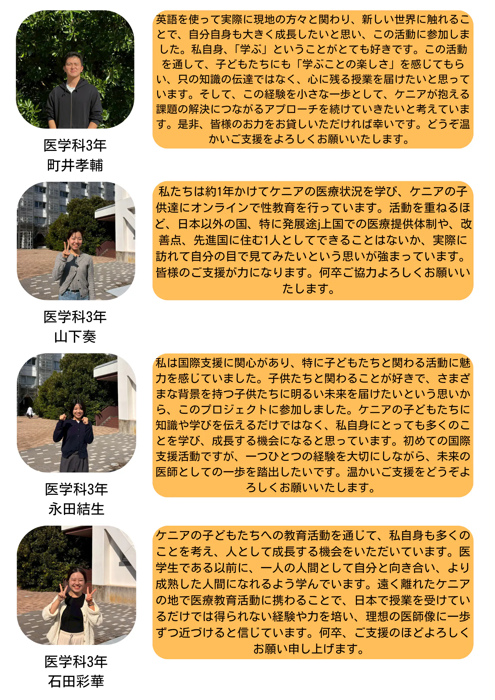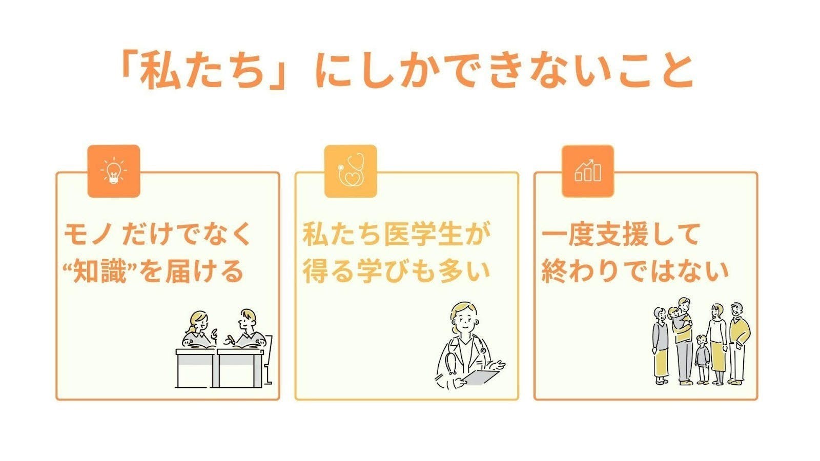 たまたま日本で医学を学べている私たちの知識を、自分たちだけの特権にせず、それを必要としている人たちへ、義務教育の行き届いていないケニアの子どもたちへ届けたい。同じスタートラインを用意してあげたい。それが、今の自分たちにできる一つの「形」だと考えました。