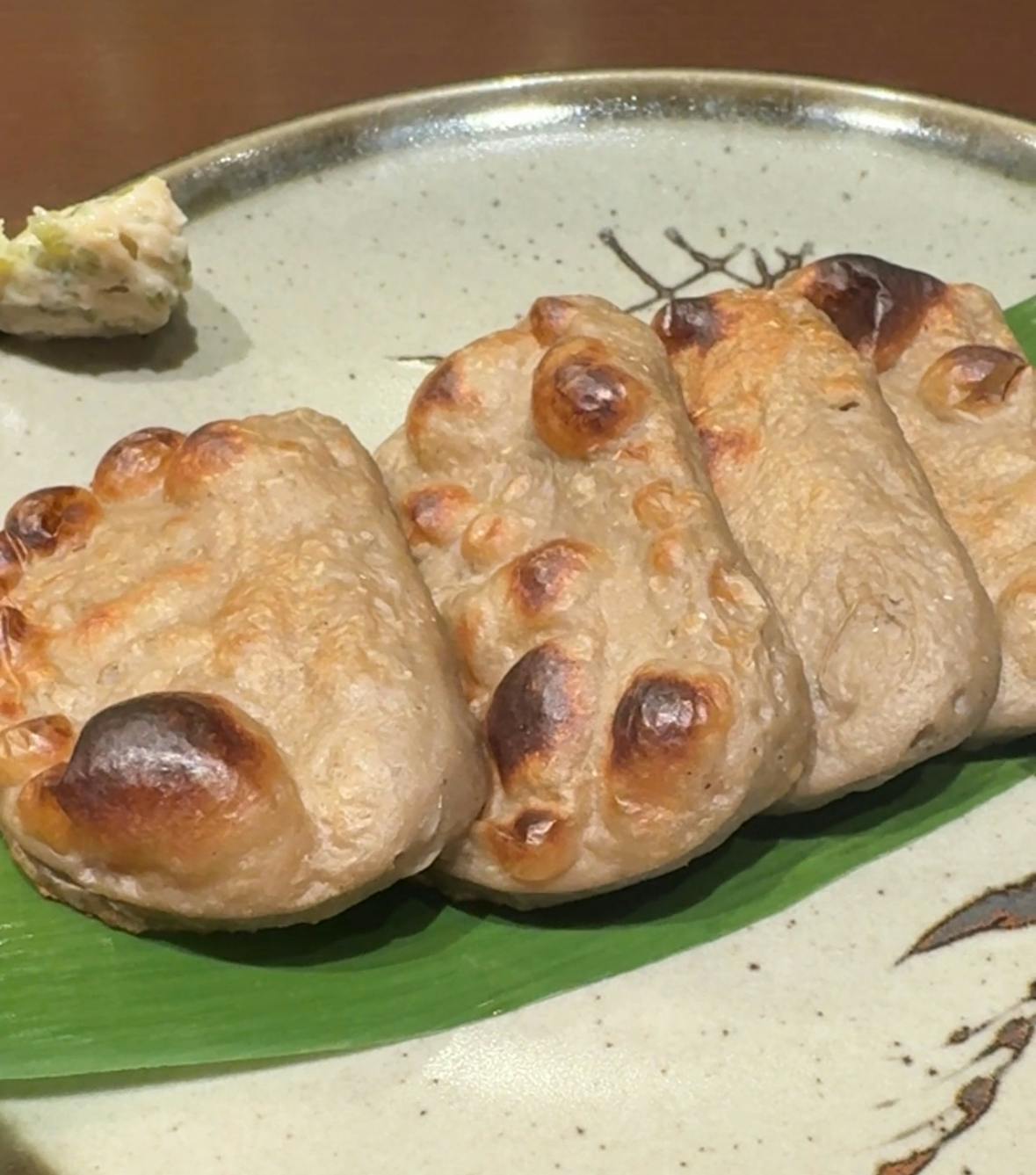 黒はんぺん焼きは、これも地元の名産、「わさび漬け」と一緒にどうぞ