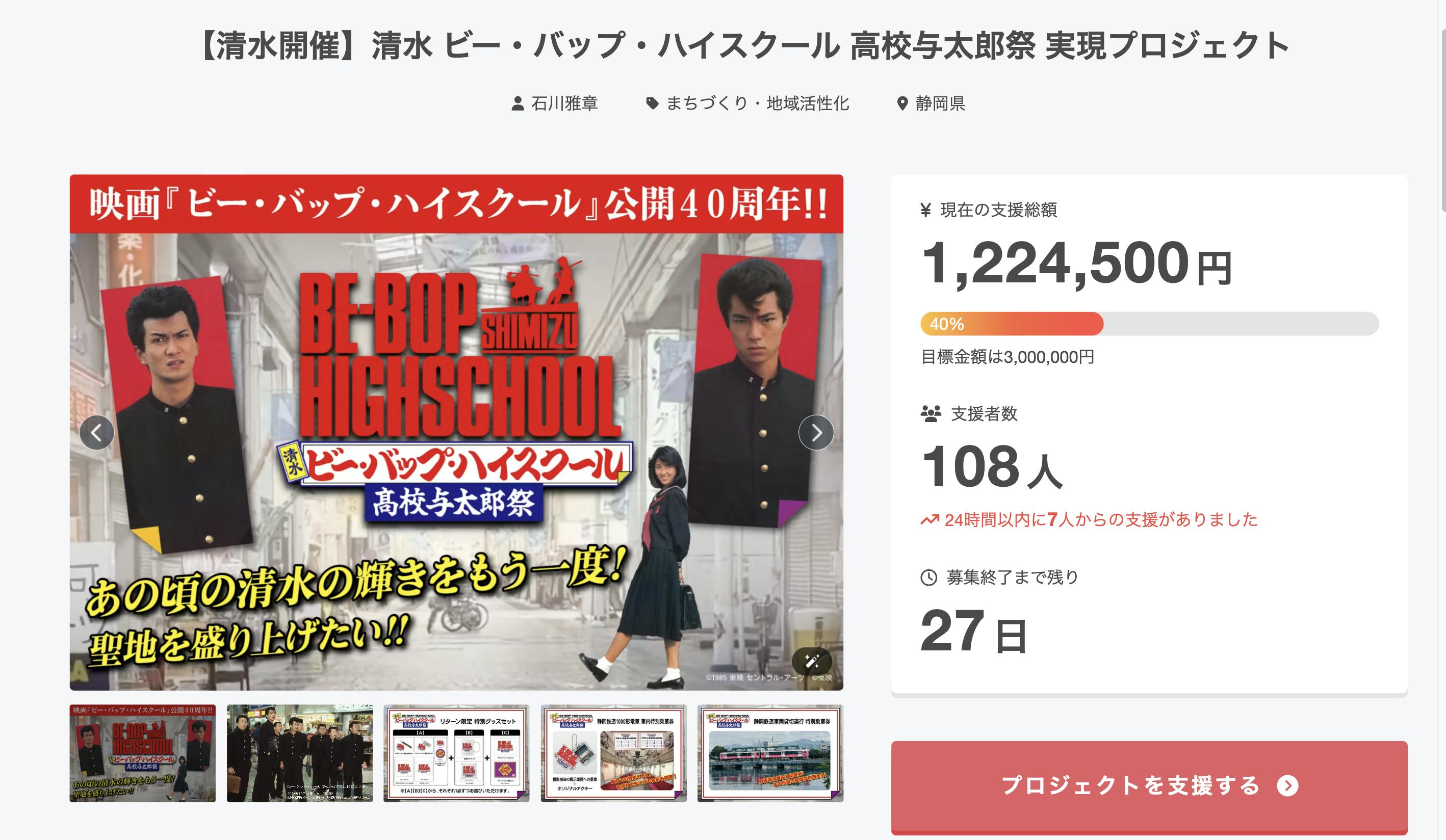 こんばんは!清水 ビー・バップ・ハイスクール 高校与太郎祭 実行委員会の石川です。9月26日(金)12:00にクラウドファンディングをスタートして、ちょうど2週間が経過しました。私自身、はじめてのクラファンということで、不安もたくさんありましたが、2週間経過した10月10日時点で、支援金額が1,735,000円、支援者数150人のみなさまから、ご支援をいただけたこと、本当に嬉しく、心より感謝申し上げます。支援者の皆様からのコメントを何度も何度も読み返し、大きな勇気と元気をいただいております。あたたかいコメントのひとつひとつから、同世代の皆さんの笑顔を想像し、そして、40年前からつながりのある勝手な仲間と思っているのです。無謀ながらもビー・バップのイベントにチャレンジすることが出来たのは、大好きな街、清水の元気を取り戻したい!この気持ちが勝っていたのと、50代に突入して、このようなチャレンジを、多くの仲間と取り組ませていただけるのも、本当に幸せだと感じております私が、中学、高校生の頃は、まさしく「シャバ憎」でした夢も希望もなく、ただただ、毎日を無駄に過ごしていました今回、このイベントの実現に向けてチャレンジすることが出来るのは、支援者のみなさんがいてくれて、そして、関係者の皆さんと日々ワイワイやりながら、ゼロからイチを創り上げていく、そんな時間を大切に出来るようになったからかもしれませんビー・バップ・ハイスクールは、40年前の私たちに、夢や希望を与えてくれました清水の町をロケ地にしてくれたのには、何かの運命があるのかもしれませんさあ、残り3週間!!!どうせなら、とことんやり抜こうと思いますまずは、クラファンに挑戦しながら、同時にイベントの企画内容を進めていく!仲間と共にチャレンジ出来る事を幸せに感じ、これからも笑顔を忘れず楽しんでいきたいと思いますこのプロジェクトを、もっともっと多くの方に知ってもらいたく、ぜひ、みなさまからシェアしていただけますと嬉しいです引き続き宜しくお願いします!