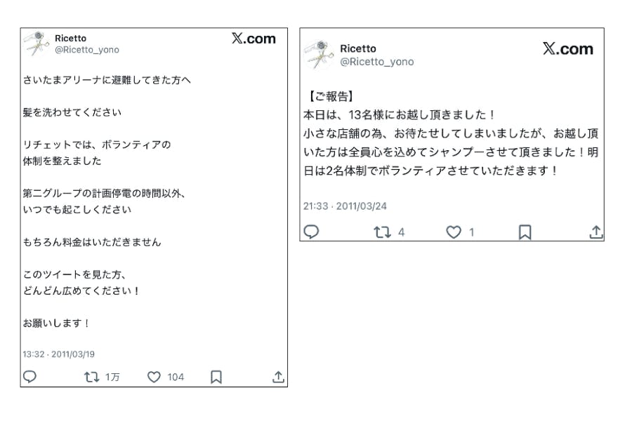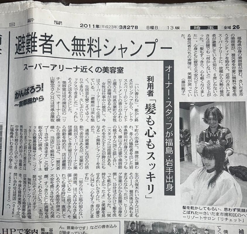 また、東日本大震災の際には、被災された方に無料でシャンプーサービスを行いました。