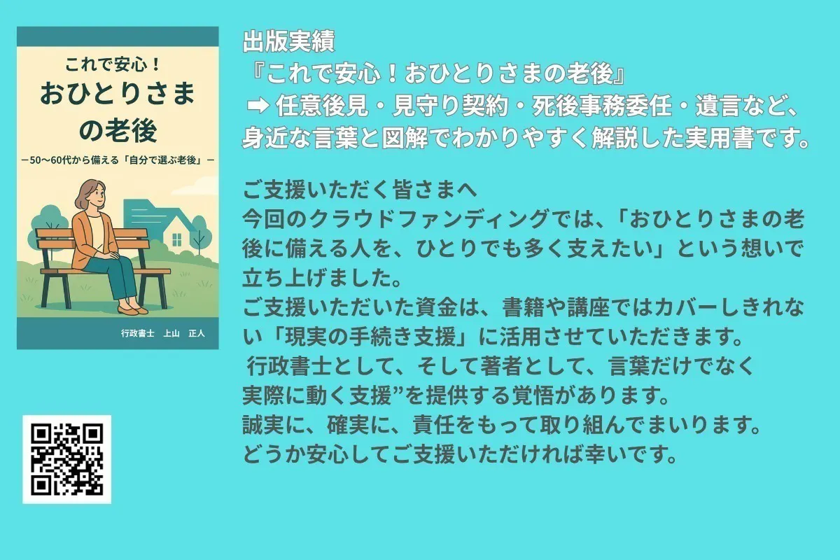 そのために、著書『これで安心!おひとりさまの老後』では、見守り契約・任意後見・死後事務委任契約などを一般の方にもわかりやすく紹介し、制度が“使える知識”になるよう努めてきました。