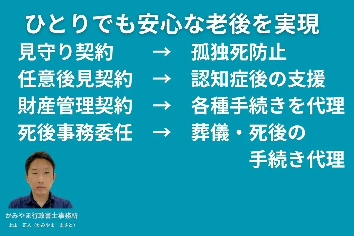 「見守り契約」「死後事務委任契約」「財産管理契約」「遺言書作成」の業務経験あり→ 実務フロー・契約書式・説明資料も一式整備済み
