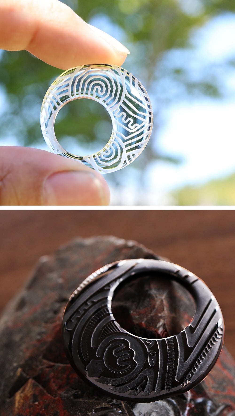 清らかな水晶には、光を透過することで文様が繊細かつ幻想的に浮かび上がり、深遠なオニキスには、漆黒の中に文様がシャープで力強く浮かび上がります。