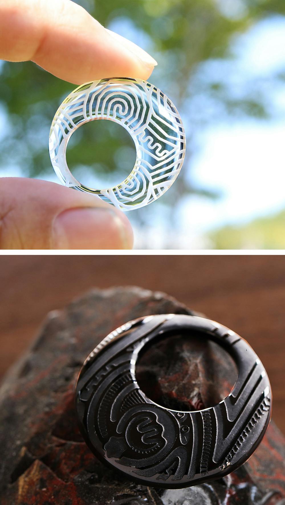清らかな水晶には、光を透過することで文様が繊細かつ幻想的に浮かび上がり、深遠なオニキスには、漆黒の中に文様がシャープで力強く浮かび上がります。