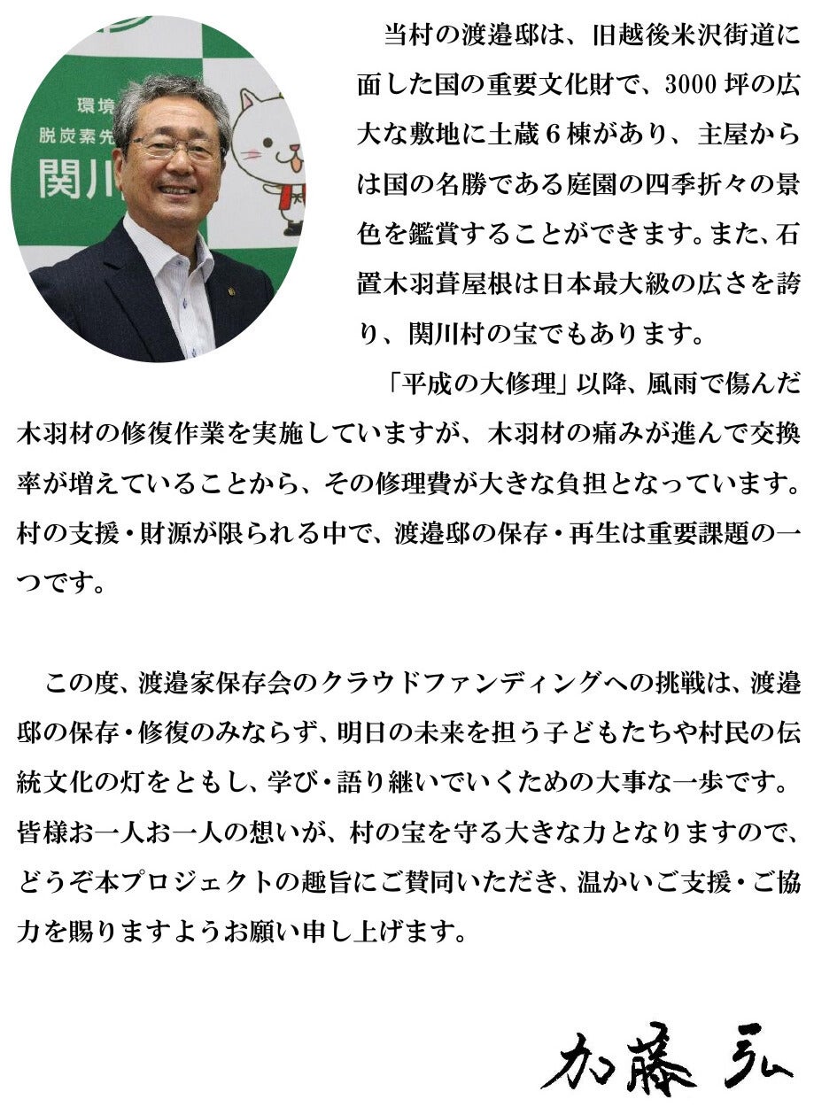 2026/03/11 15:58皆様、いつも重要文化財「渡邉邸」の保存プロジェクトを応援いただき、誠にありがとうございます。公益財団法人重要文化財渡辺家保存会です。プロジェクト開始以降、多くの方から温かいご支援と応援のメッセージを頂戴し、心より感謝申し上げます。クラウドファンディングの期限まで、残り4日(3月15日23:59まで)となりました。3月11日現在、75名もの方々から、目標を上回る1,041,600円のご支援をいただくことができました。心より感謝申し上げます。皆様から寄せられた「大切な文化財を守ってほしい」「一度行ってみたい」といった温かいコメントの一つひとつが、私たち保存会メンバーにとって大きな励みとなっております。おかげさまで第一目標の金額を達成することができましたが、渡邉邸の屋根修理には毎年約900万円という莫大な費用がかかります。今回のクラウドファンディングでいただいたご支援は、手数料を除いた全額を、本年度および来年度の屋根修繕費用として大切に活用させていただきます。募集期限の3月15日まで、引き続きご支援を受け付けております。 この貴重な「石置木羽葺屋根」を、そして関川村の歴史を次世代へ繋いでいくため、最後まで伴走いただけますと幸いです。残りわずかな期間となりますが、引き続きの応援をどうぞよろしくお願いいたします!公益財団法人重要文化財渡邉家保存会 もっと見る