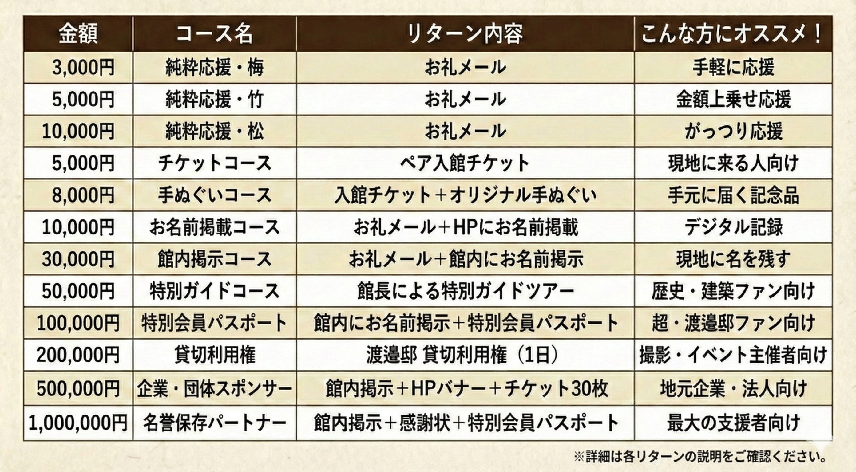 歴史ある渡邉邸や公式サイトに、支援者様のお名前を記録いたします。