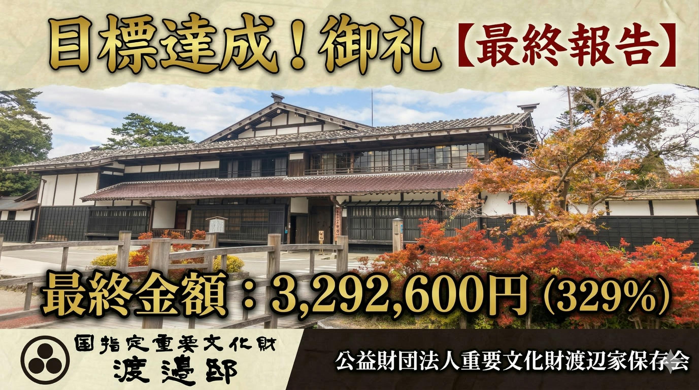 2026/03/16 17:013月15日をもちまして、クラウドファンディングの全日程を終了いたしました。最終的に、当初の目標を大きく上回る総額3,292,600円という多大なるご支援をいただくことができました。まずは、この挑戦を最後まで支えてくださったすべての皆様に、保存会一同、心より厚く御礼申し上げます。一ヶ月という期間中、皆様から寄せられた温かい応援メッセージは、私たちにとって何よりの財産となりました。関川村の、そして日本の宝である渡邉邸が、いかに多くの方々に愛されているかを再認識し、身の引き締まる思いです。皆様から託していただいた貴重な支援金は、渡邉邸の象徴である「石置木羽葺屋根」の修理費用として大切に活用させていただくとともに、より多くの方々に渡邉邸へ足を運んでいただけるよう、建物の歴史や美しさを体験できる新たなコンテンツの制作・整備にも充てさせていただきます。【リターンの発送・ご案内について】ご支援いただいた皆様へのリターンにつきましては、現在大切に準備を進めております。準備が整い次第、順次お届けや詳細なご案内の連絡をさせていただきますので、お手元に届くまで今しばらくお待ちいただけますと幸いです。クラウドファンディングという形での募集は一度区切りとなりますが、渡邉邸を守り、次世代へ繋いでいく挑戦はこれからも続いてまいります。今後とも、ご入館やイベントなどを通じて、引き続き渡邉邸を見守り、温かいご支援をいただけますと幸いです。改めまして、この度は誠にありがとうございました。 皆様のまたのご来邸を、保存会一同、心よりお待ち申し上げております。公益財団法人重要文化財渡辺家保存会 一同 もっと見る