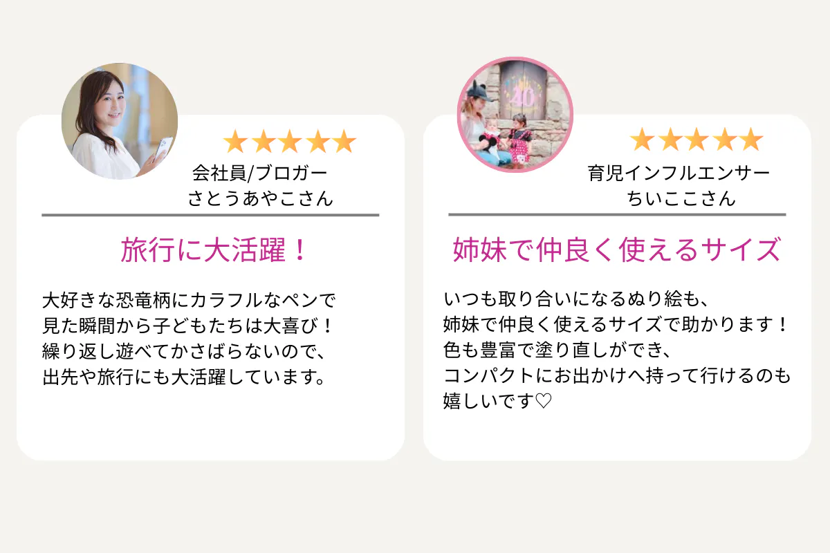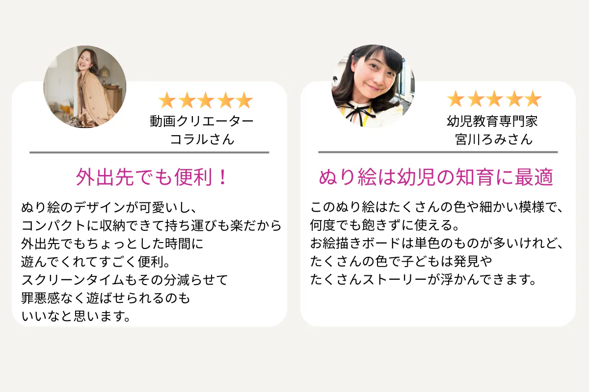 そしてこのセットがママ・パパに支持される理由は、知育だけじゃありません。動画に頼りがちな 食事の待ち時間・移動中・下の子対応のタイミング に、子どもが自然と夢中になれる「静かな遊び」があることで、スクリーンタイムの軽減に活躍するぬり絵です。