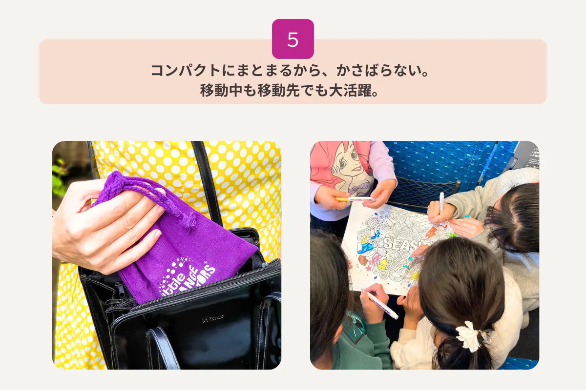 電車や飛行機などの移動中はもちろん、レストランの待ち時間、実家や旅行先、病院の待合室など「ちょっと間をもたせたい」場面でサッと取り出して使えます。準備も片付けも簡単だから、移動先でもストレスなく、忙しい親子の外出をしっかり支えてくれます。