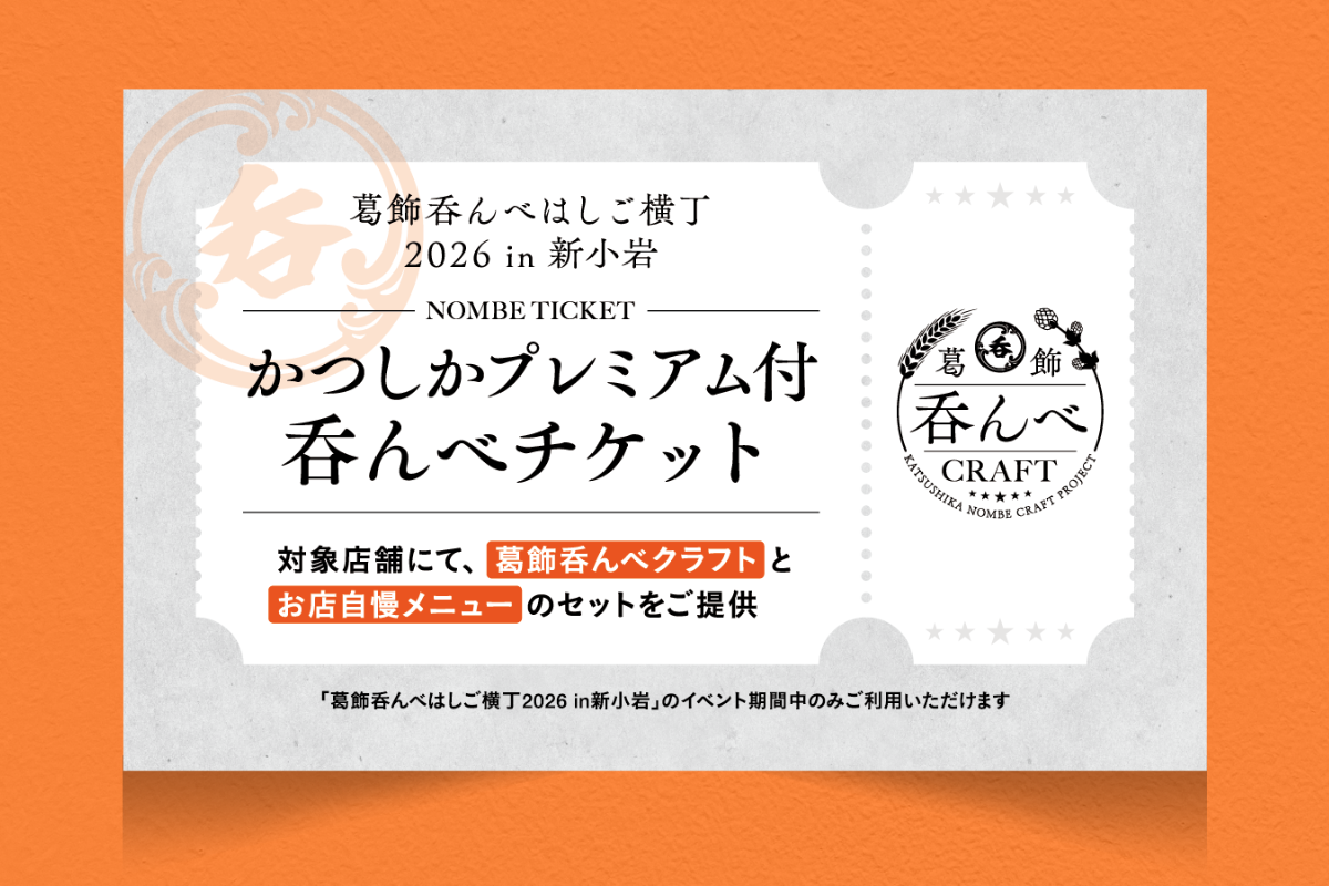 すでに動いている企画に、新小岩の飲食店をめぐるイベント「葛飾呑んべはしご横丁2026 in新小岩」があります。これは、イベントのチケット「かつしかプレミアム付呑んべチケット」を購入した方に、対象店舗にて葛飾呑んべクラフトと店自慢のおつまみのセットをお得にご提供するという企画です。